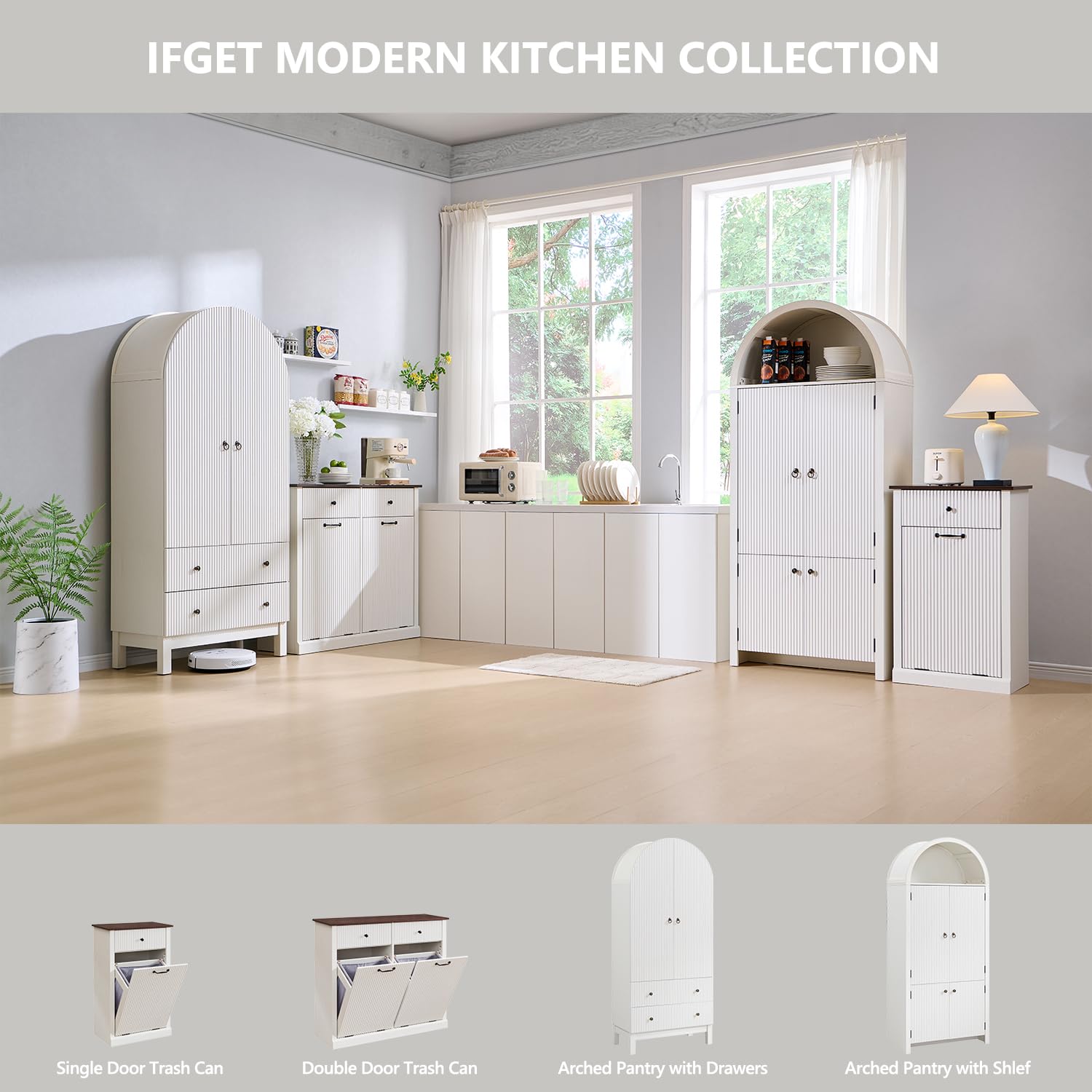 - Modern Fluted Design: The unique wave-shaped fluted panels enhance the texture and spatial feel of this exceptional piece. The modern wood texture design seamlessly blends elegant lines with a smooth surface, boosting visual appeal and modern aesthetics. This versatile wooden trash cabinet complements both modern and classic styles, making it a perfect addition to your kitchen, dining room, living room, laundry room, and more