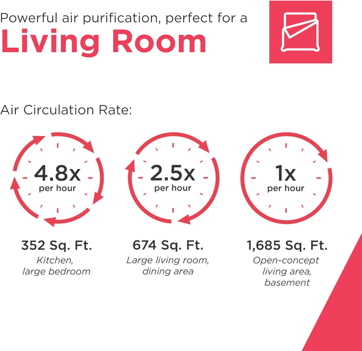 • Continuous Air Circulation: This air purifier filters the air 4.8x per hour in rooms up to 351 sq. ft. or 1x per hour in rooms up to 1,685 sq. ft., ensuring consistent air quality and freshness*