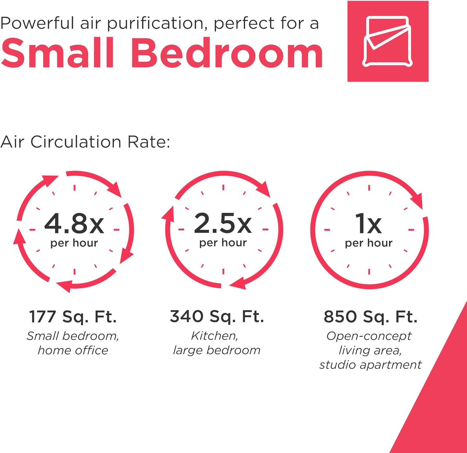 • Continuous Air Circulation: This air purifier filters the air 4.8x per hour in rooms up to 177 sq. ft. or 1x per hour in rooms up to 850 sq. ft., ensuring consistent air quality and freshness*