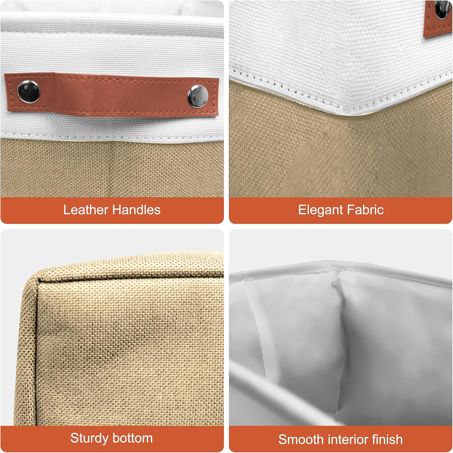 11in Open Fabric Storage Basket with Leather Handles for Organizing, Collapsible Linen Closet Bins for Shelves, Closets, Laundry, Decorative Basket for Gifts. (White&Khaki, 3PCS/11x11in)