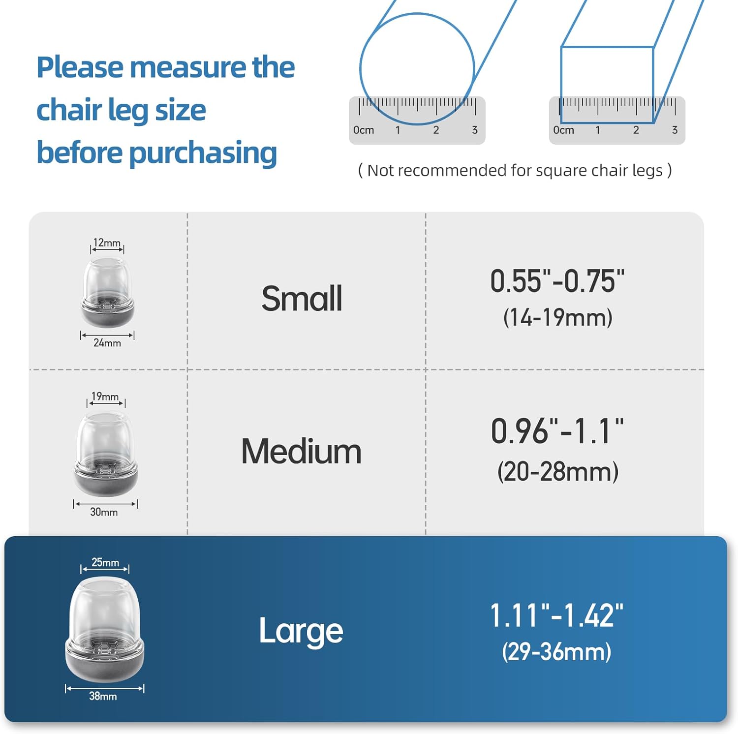 - [Multiple size options] Chair Leg Caps are elastic and can better adapt and fit the chair legs. We have three sizes (suitable chair leg diameter/side length: 0.63''-0.79''16-20mm ,0.83''-1.02''21-26mm ,1.10''-1.30''28-33mm) Warm reminder: Please carefully measure the diameter of the chair legs before ordering.