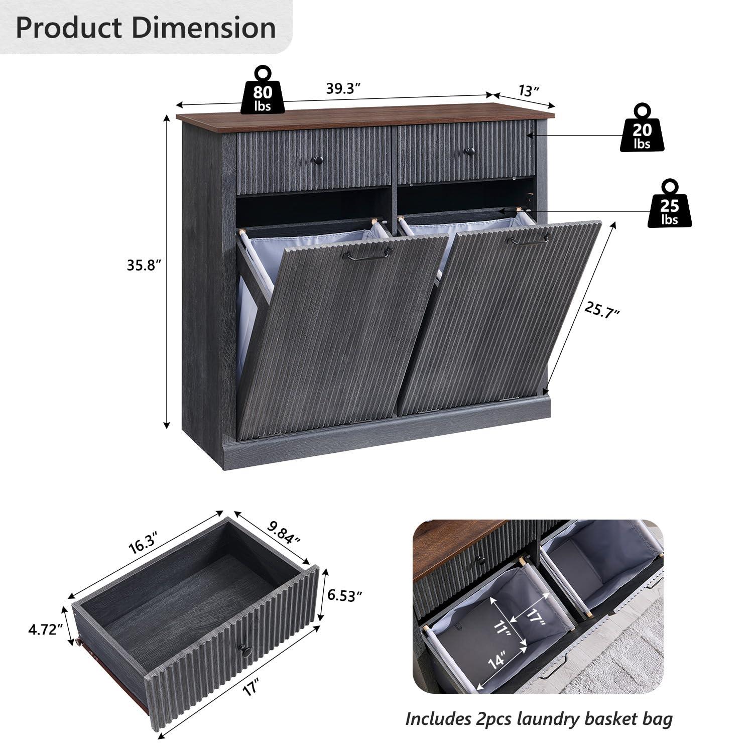 - Tilt-Out & Hidden Design: The Double Tilt-Out Trash Cabinet measures 13"D x 39.3"W x 35.8"H and this laundry basket cabinet holds 2 x 10 gallon trash can. (Package includes 2 soft laundry basket). It effectively conceals trash without taking up extra space, keeping your kitchen neat and floors clean. This design is perfect for hiding waste, preventing pets from accessing it, and isolating dirty laundry from odors, helping maintain a fresh indoor environment