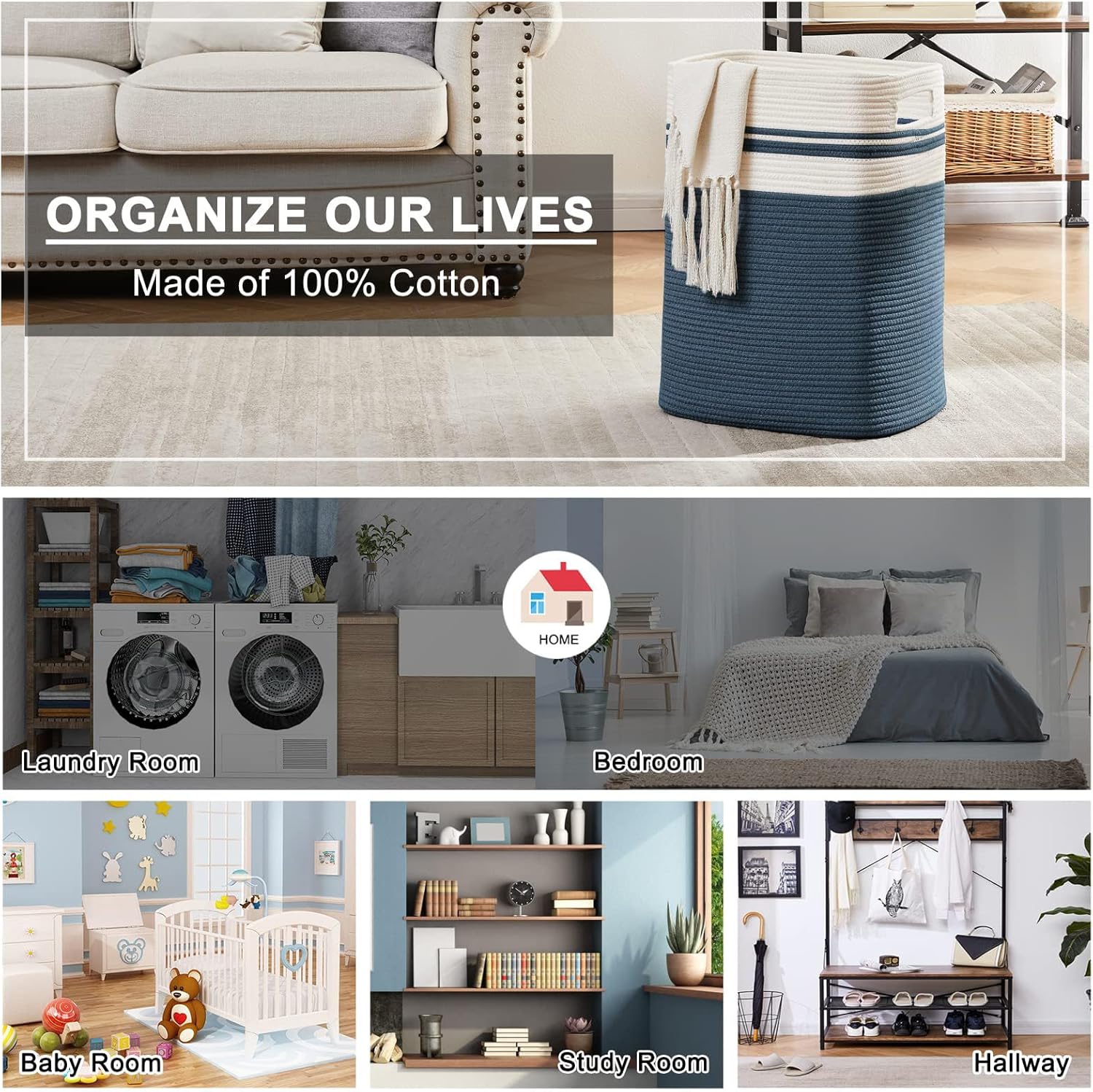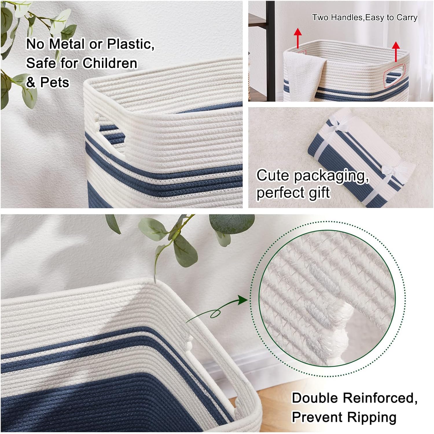 - Double reinforced Handles:We use the highest grade cotton rope as raw material and all the stitches are distribution and fine,which makes the baskets better wear resistance and durability to be used for many years.In addition,each large basket features thick,double stitching around the handles to prevent ripping and keep its shape,never fall off