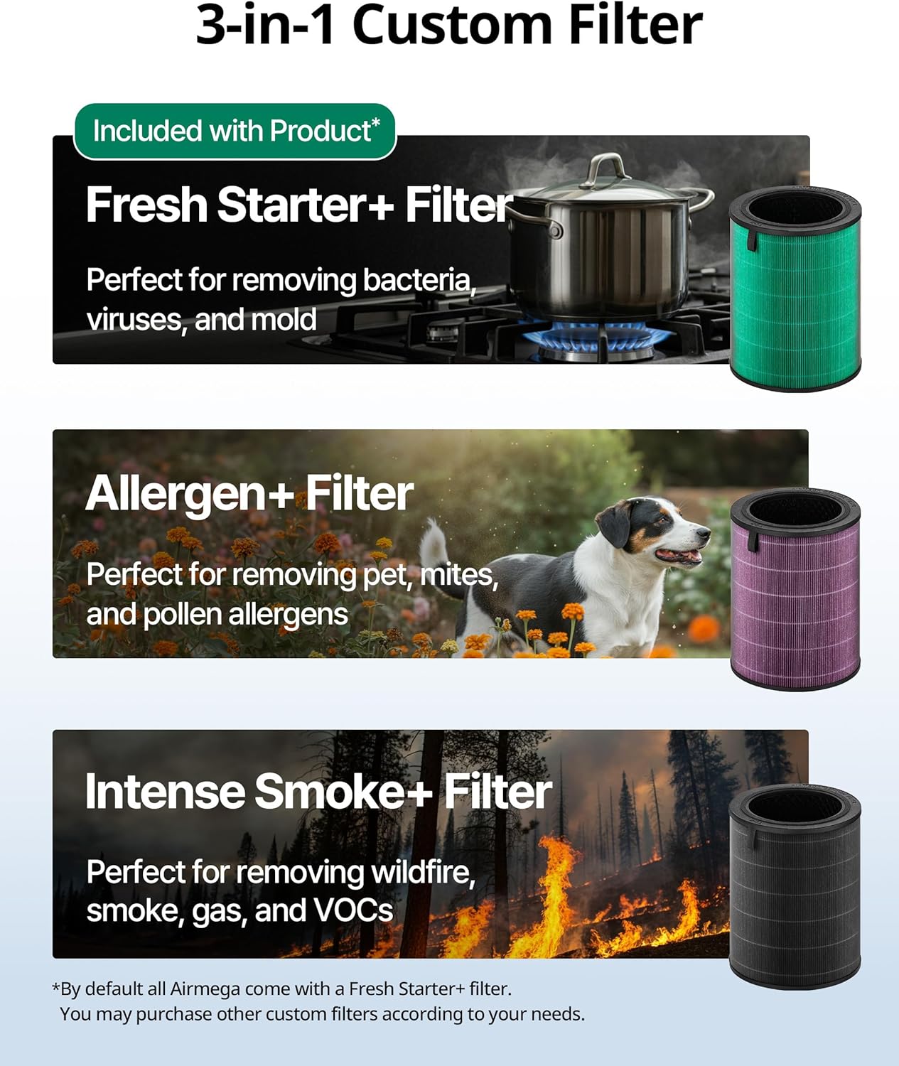 • PERSONALIZED AIR CARE Tailor your air purification experience to your needs with a custom 3-in-1 filter. Fresh Starterplus for unwanted VOCs, and odors. Allergenplus for pollen, dust mites, fungi, and pet dander. Intense Smokeplus for wildfires, pollution and industrial fumes.
