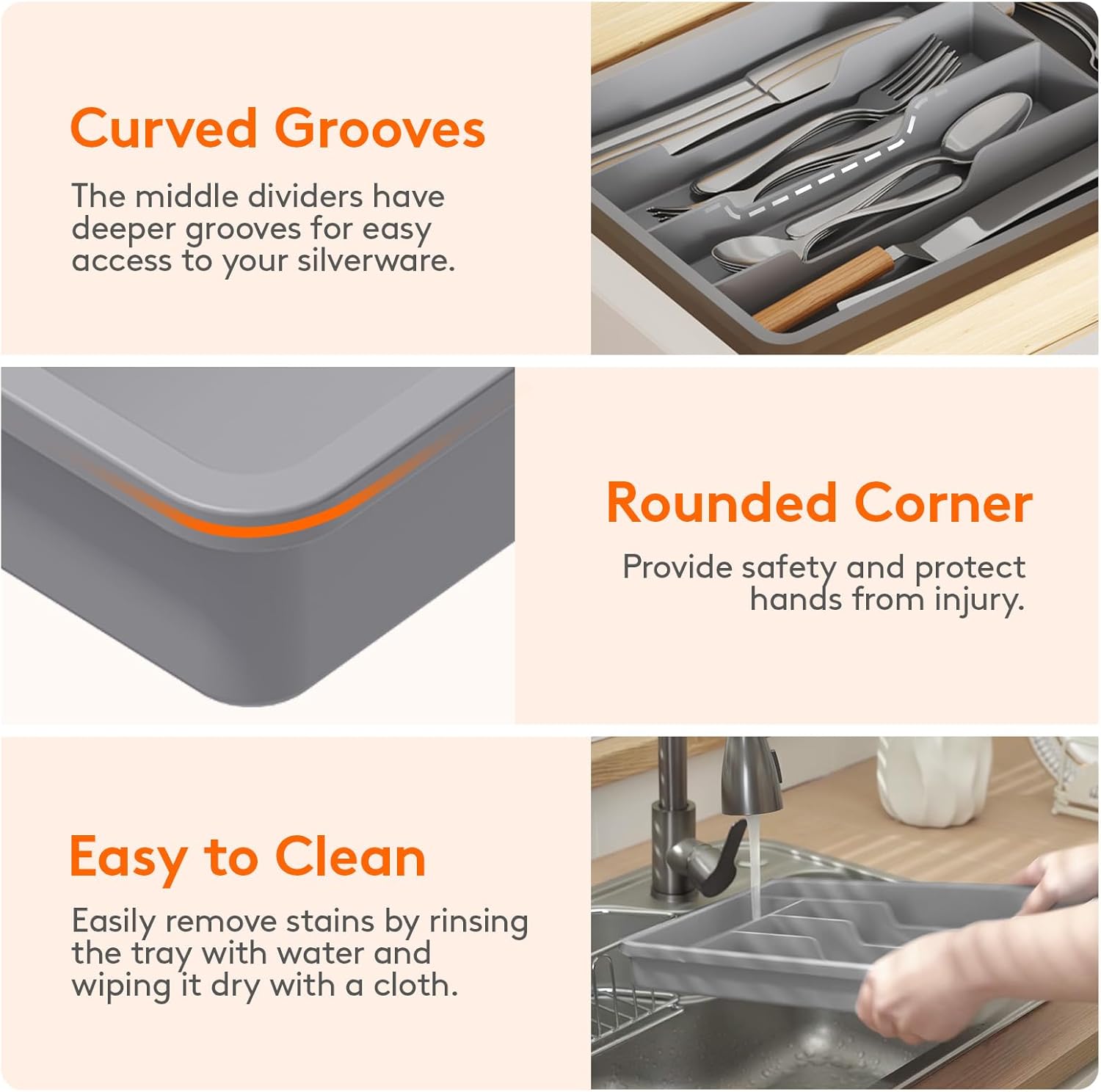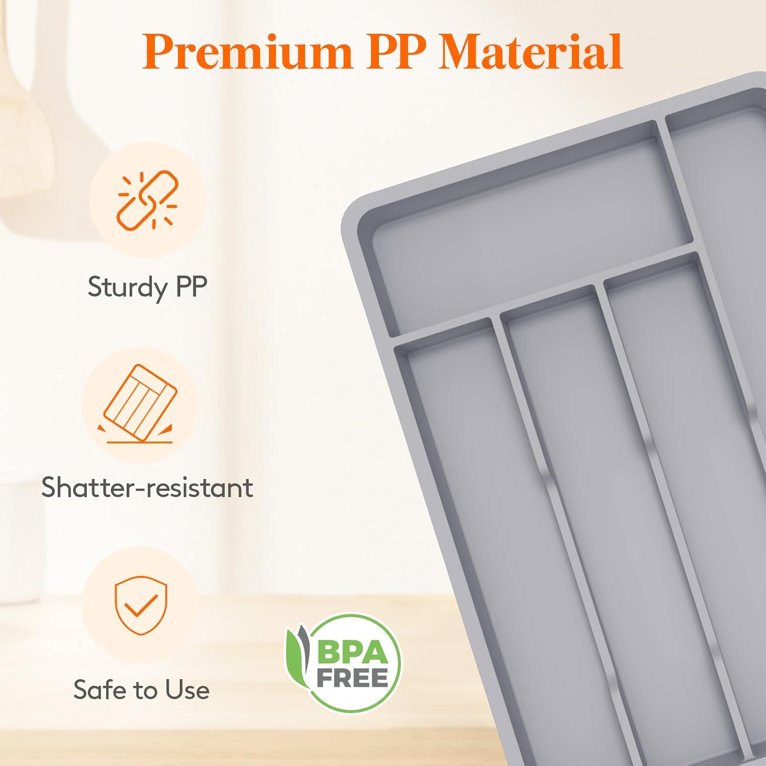 • Robust and Safe: This kitchen drawer organizer is crafted from premium PP material, BPA-free and built to last. It ensures your silverware is stored in a healthy, safe environment for worry-free use