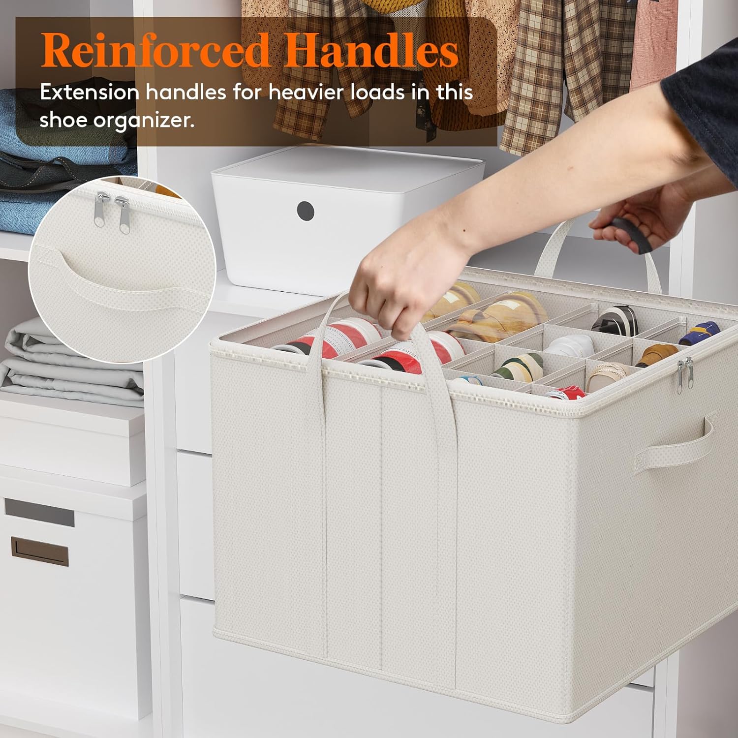 • Reinforced Structure: Crafted from non-woven fabric and reinforced cardboard, this shoe box features three sturdy handles for easy transport. Its robust side and bottom panels ensure shape retention under pressure, offering reliable long-term use