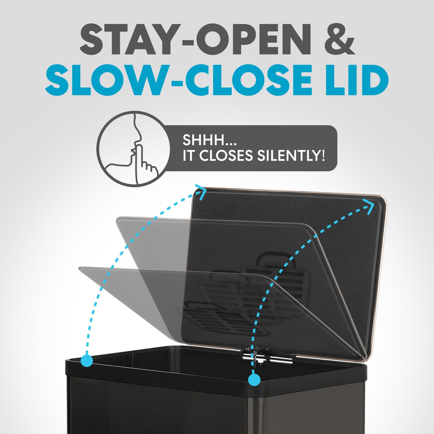 • Quiet-Close Lid: Lid closes quietly and gently without slamming. Hands Free and Fingerprint Proof: Hands-free operation with durable a metal foot pedal and fingerprint-resistant stainless steel finish leads to your trash can staying cleaner longer