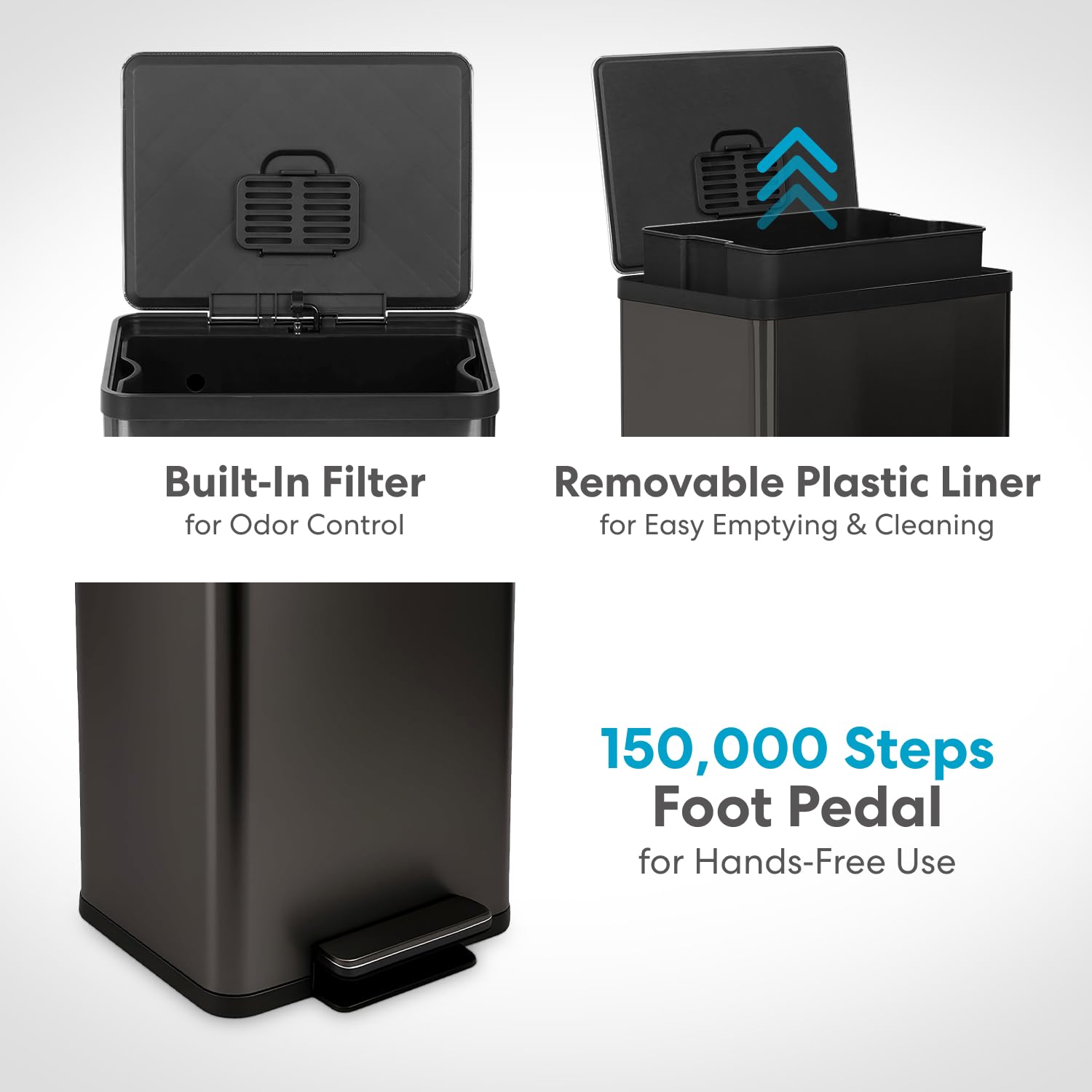 • 13 Gallon Step Trash Can: Ideal for kitchen use, this can fits most brands of trash bags