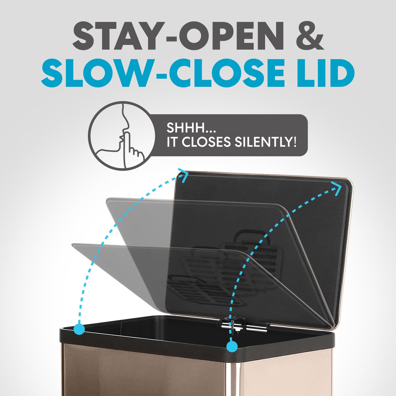 • Quiet-Close Lid: Lid closes quietly and gently without slamming. Hands Free and Fingerprint Proof: Hands-free operation with durable a metal foot pedal and fingerprint-resistant stainless steel finish leads to your trash can staying cleaner longer