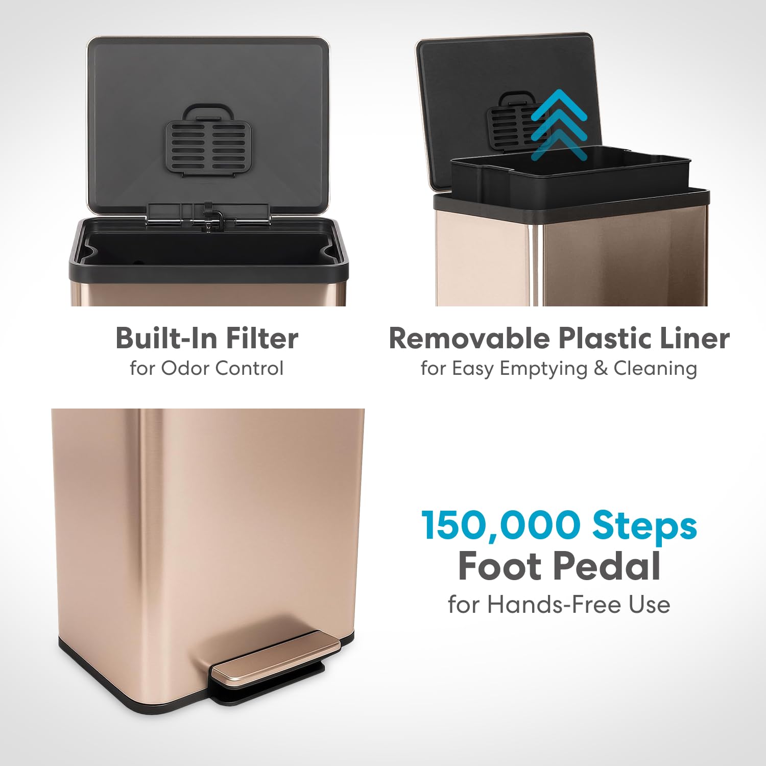 SIMPLI-MAGIC 13.2 Gallon (50L) Step Trash Can – Kitchen Garbage Can with Slow-Close Lid – Odor Control, Hands-Free, Easy to Clean, Brushed Stainless Steel (Rose Gold)