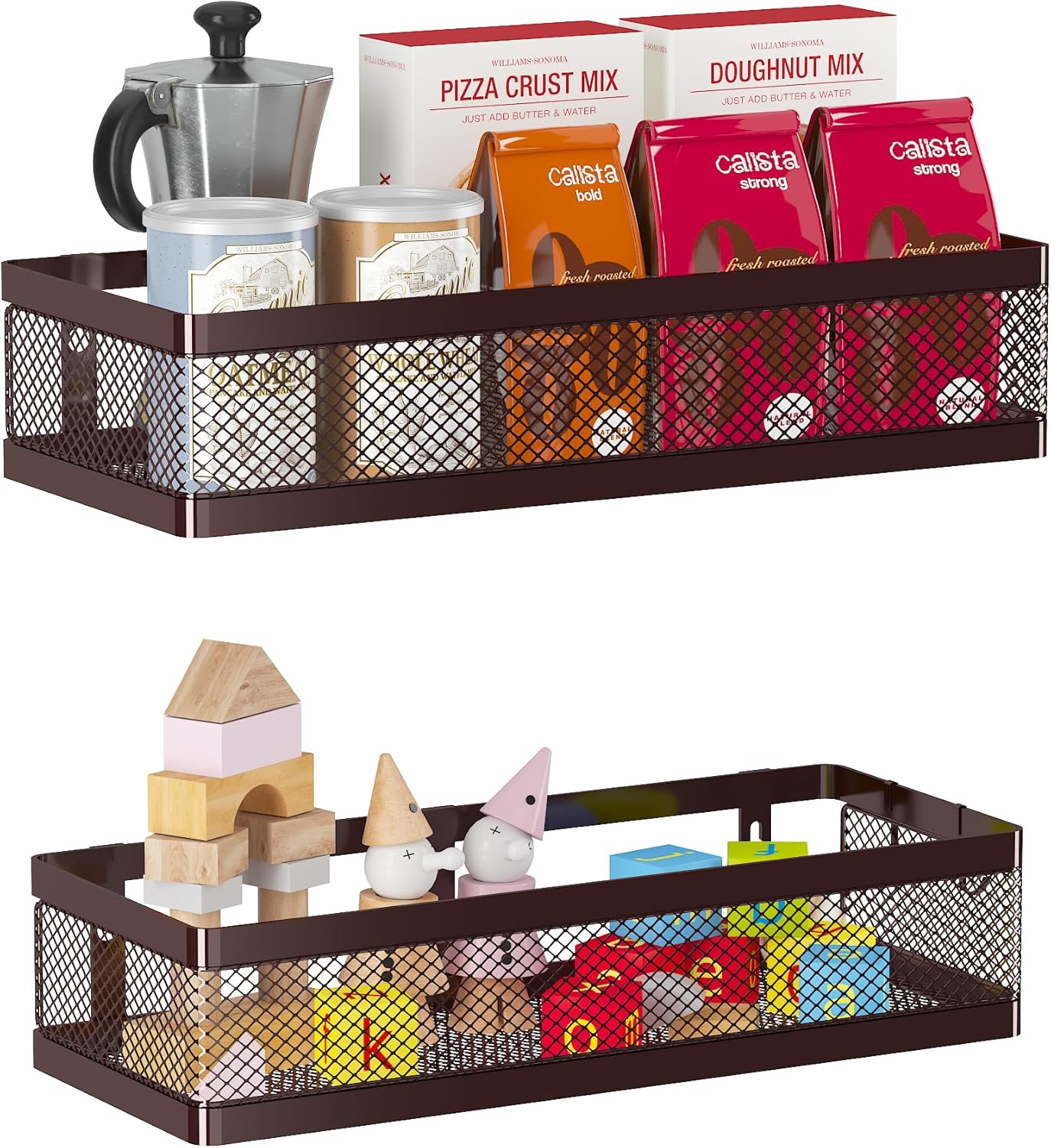 - 【MULTI-PURPOSE&MULTIFUNCTIONAL】The perfect solution for organizing a multitude of every items indoor or outdoor. The cabinet organizer hanging baskets wall mount is Ideal for organizing and storing spice bottles, pantry items, snacks, toiletries, tools, craft supplies,etc. And this metal bin basket free up enough space for your homes, kitchen, living room, bathroom, camper, farmhouse, apartments, college dorm rooms, etc.