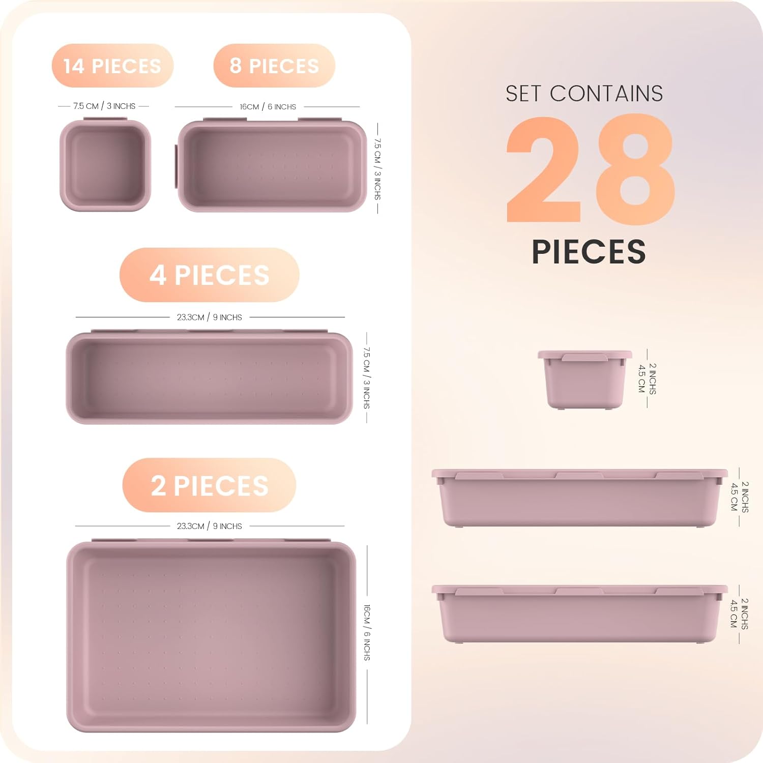 • 【28Pcs & 4 Sizes】 ---- One set includes Purple 28pcs storage bins in 4 different sizes, which help you customize combinations to store items and organize drawer in shelves/closets/cabinets/dressers. Includes: 9 inch*6 inch*2 inch, 8 Long sizes:6 inch*3 inch*2 inch, 4 Medium sizes:9 inch*3 inch*2 inch, 14 Small sizes:3 inch*3 inch*2 inch.