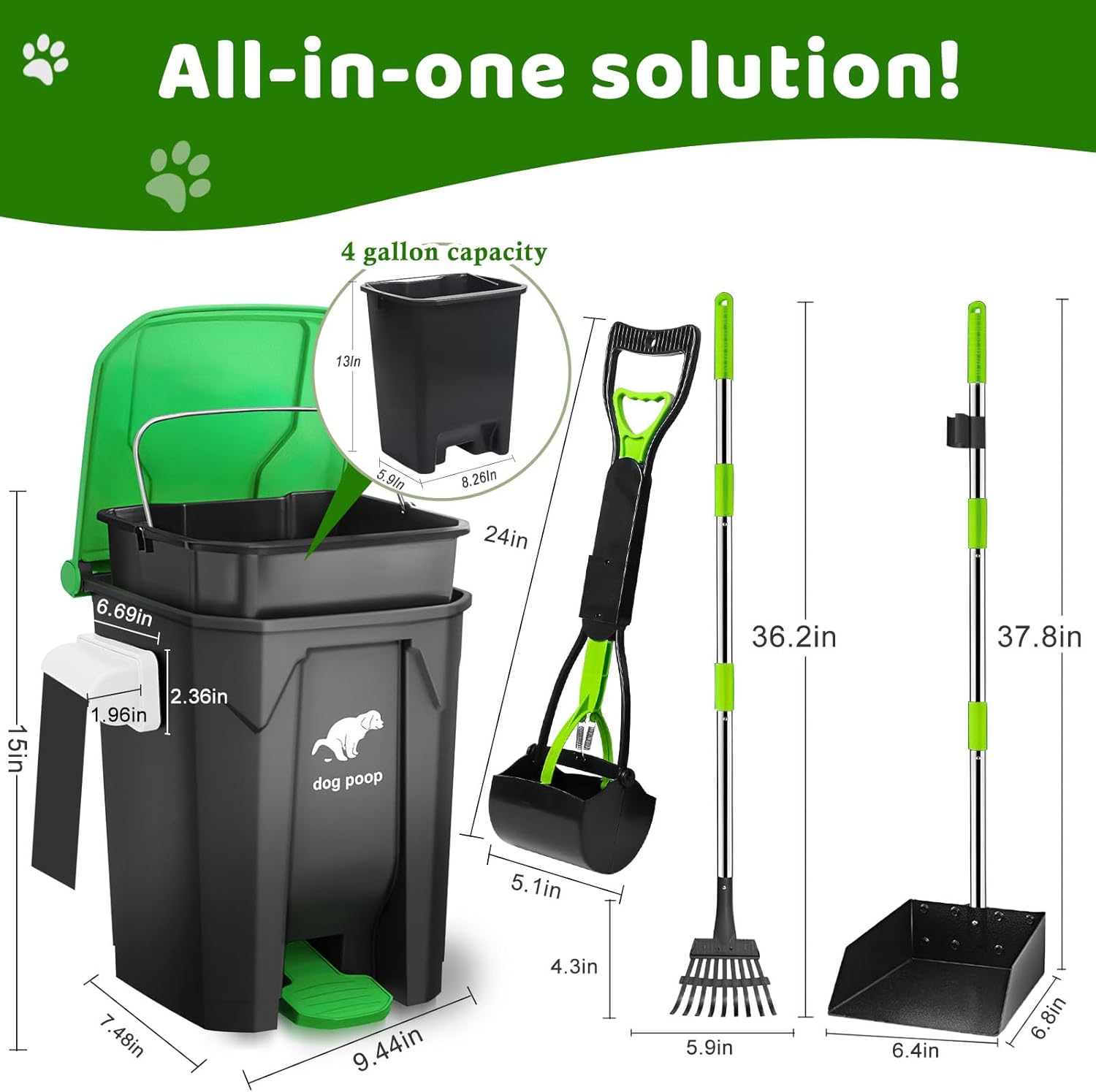 • Product Includes: A fully assembled 20L outdoor dog poop trash can with lid,and a 4 gallon Inner Waste Bin; You will also receive a metal rake & tray, a foldable Pooper Scooper, a bag organiz box and 100 durable dog poop bags
