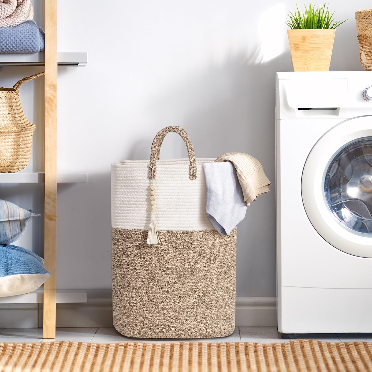 • ๐ŸŒˆ[DURABLE, BREATHABLE & SKIN - FRIENDLY COTTON]: Made of sturdy and odor-free rope cotton, woven laundry basket has a solid addition to any space. Tall laundry basket quite sturdy and spacious, capable of holding a good amount without losing its shape, which adds to its practicality.