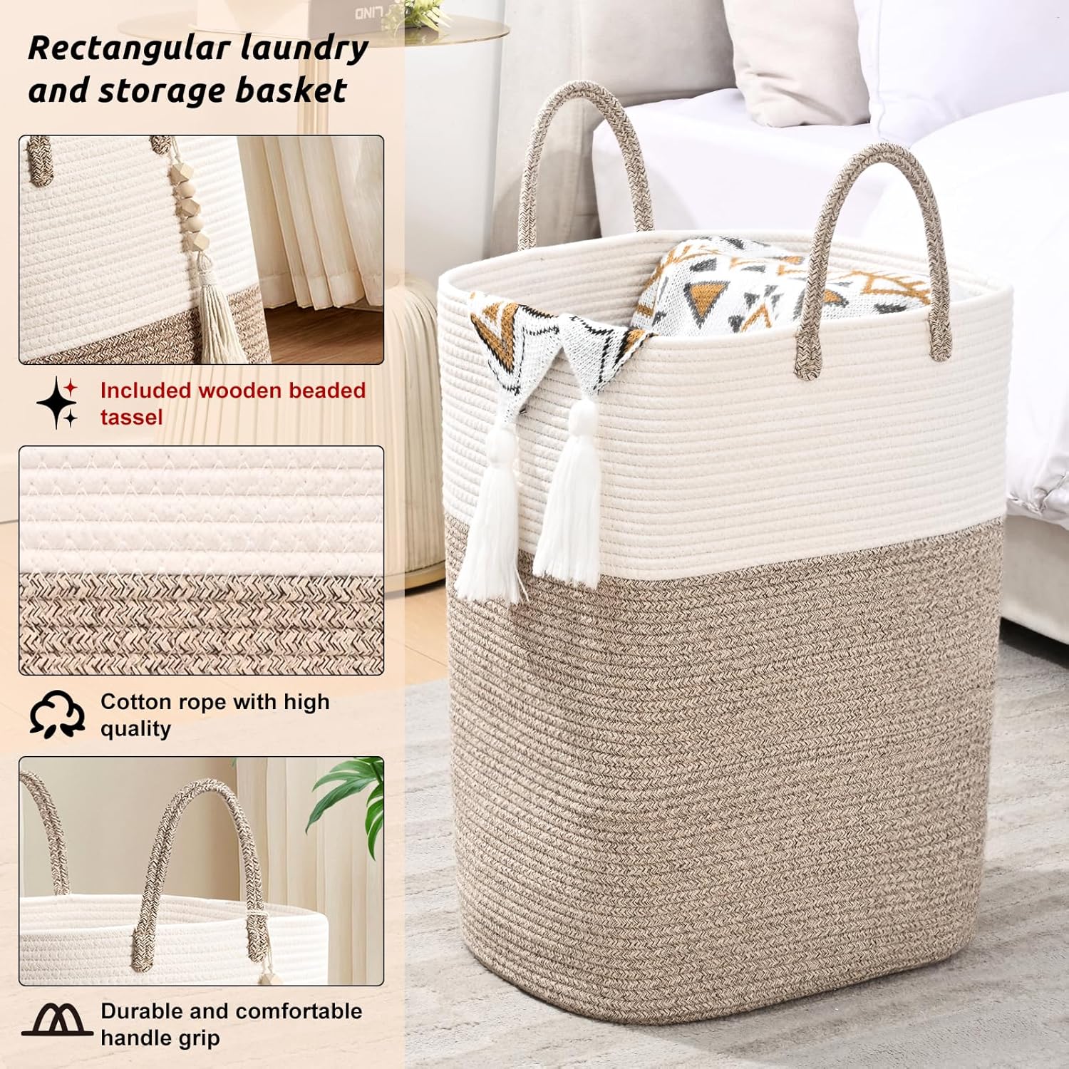 • ๐ŸŒˆ[DURABLE, BREATHABLE & SKIN - FRIENDLY COTTON]: Made of sturdy and odor-free rope cotton, woven laundry basket has a solid addition to any space. Tall laundry basket quite sturdy and spacious, capable of holding a good amount without losing its shape, which adds to its practicality.