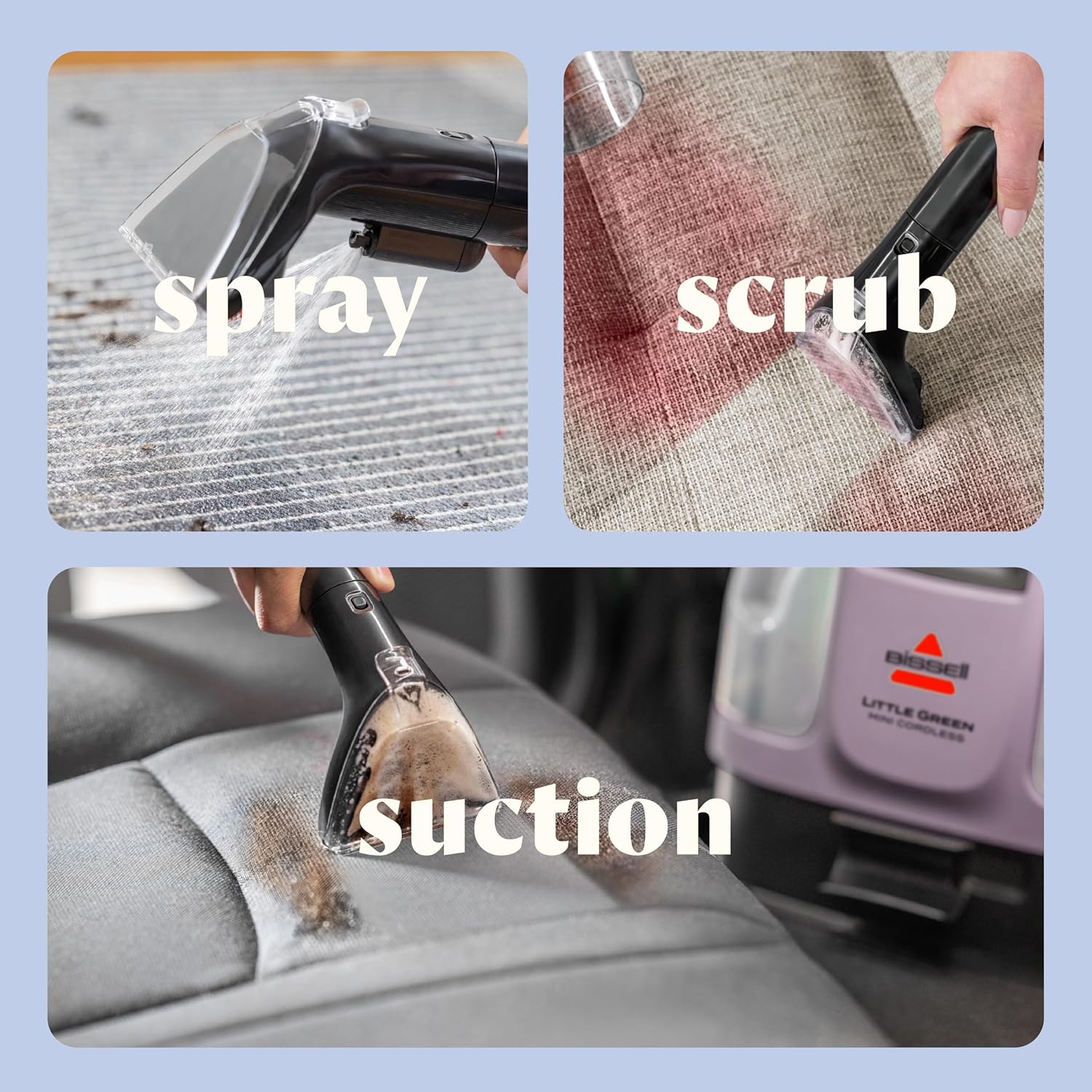 • IN THE BOX: Includes 4” tough stain tool with removeable lens, HydroRinse self-cleaning hose tool, and 8 oz. BISSELL Little Green Formula