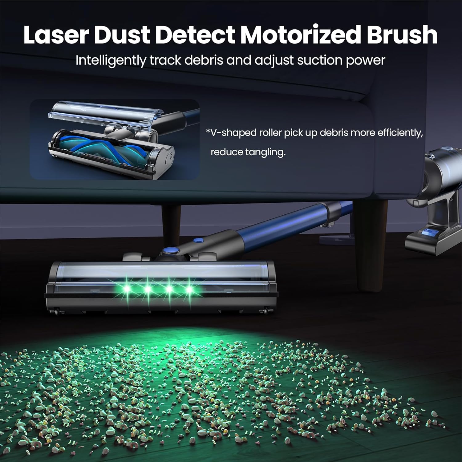 - 【Versatile Accessories】The main floor brush comes with green LED lights that make dust particles easier to see and clean. The V-shaped roller efficiently picks up debris while minimizing hair tangling, ideal for cleaning floors, carpets, and stairs. The 2-in-1 brush and crevice tool are perfect for cleaning furniture, car, and hard-to-reach areas, offering a multi-purpose cordless vacuum cleaner for home.