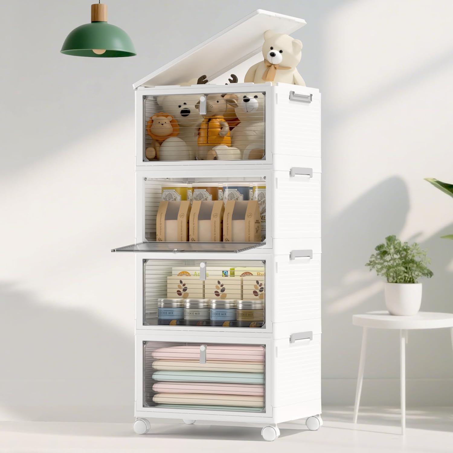 Storage Bins with Lids,4 Tier Stackable Storage Bins with Drawers,4 Pack Collapsible Plastic Storage Boxes with Wheel-1 Lid,23QT Foldable Containers for Closet Living Room Bedroom Office.
