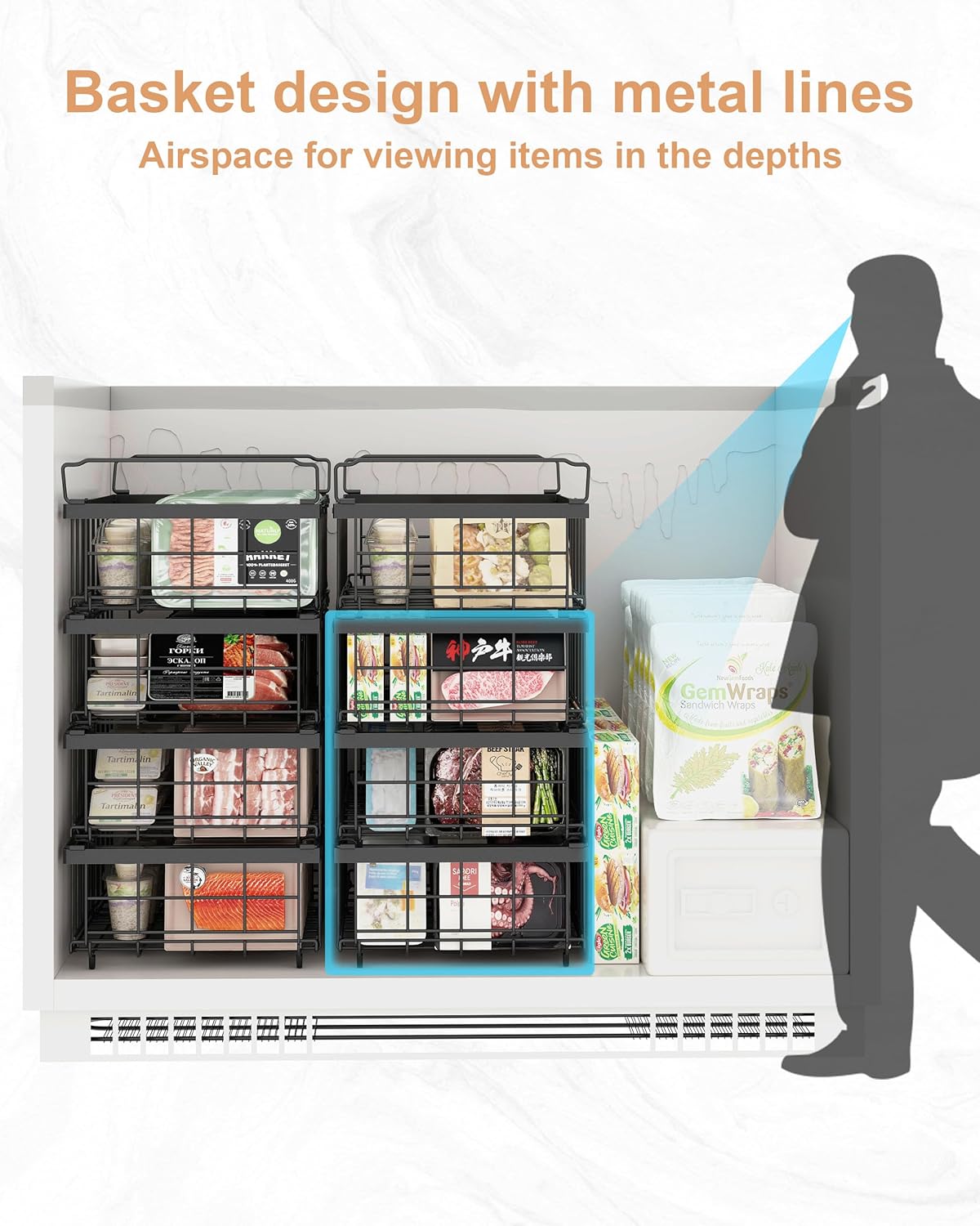 • Optimized for Fast-Freezing & Easy Access:Open-grid wire design enhances cold airflow, speeding up freezing by up to 30%. Organized into zones: bulk meats (bottom), frozen meals (middle), quick-grabs (top/hanging).