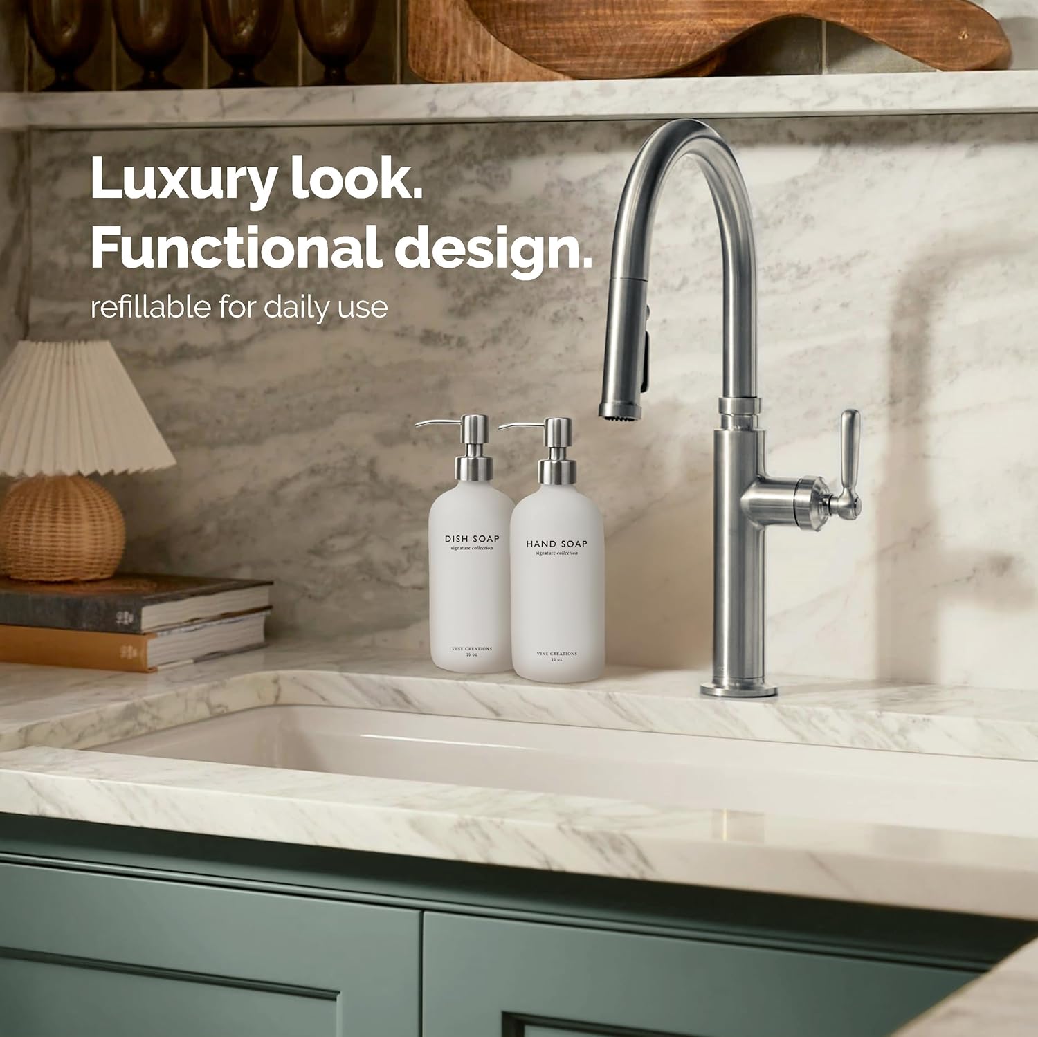 • BUILT TO PERFORM – Each dispenser is topped with a brushed nickel stainless steel pump that’s as durable as it is refined. Rust-resistant, smooth to use, and designed to complement any modern kitchen or bathroom.