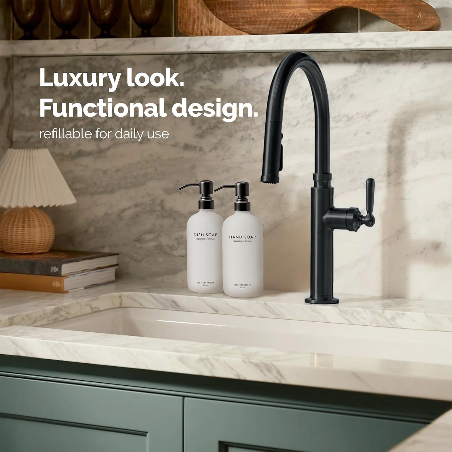 • BUILT TO PERFORM – Each dispenser is topped with a matte black stainless steel pump that’s as durable as it is refined. Rust-resistant, smooth to use, and designed to complement any modern kitchen or bathroom.