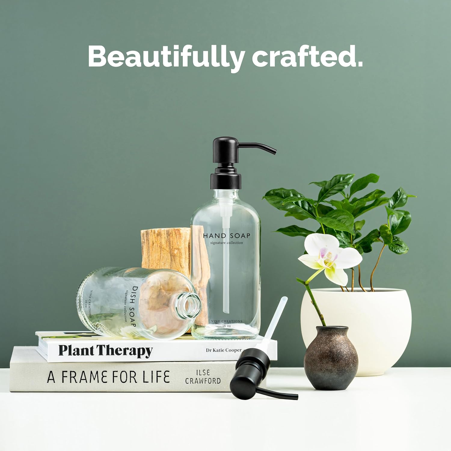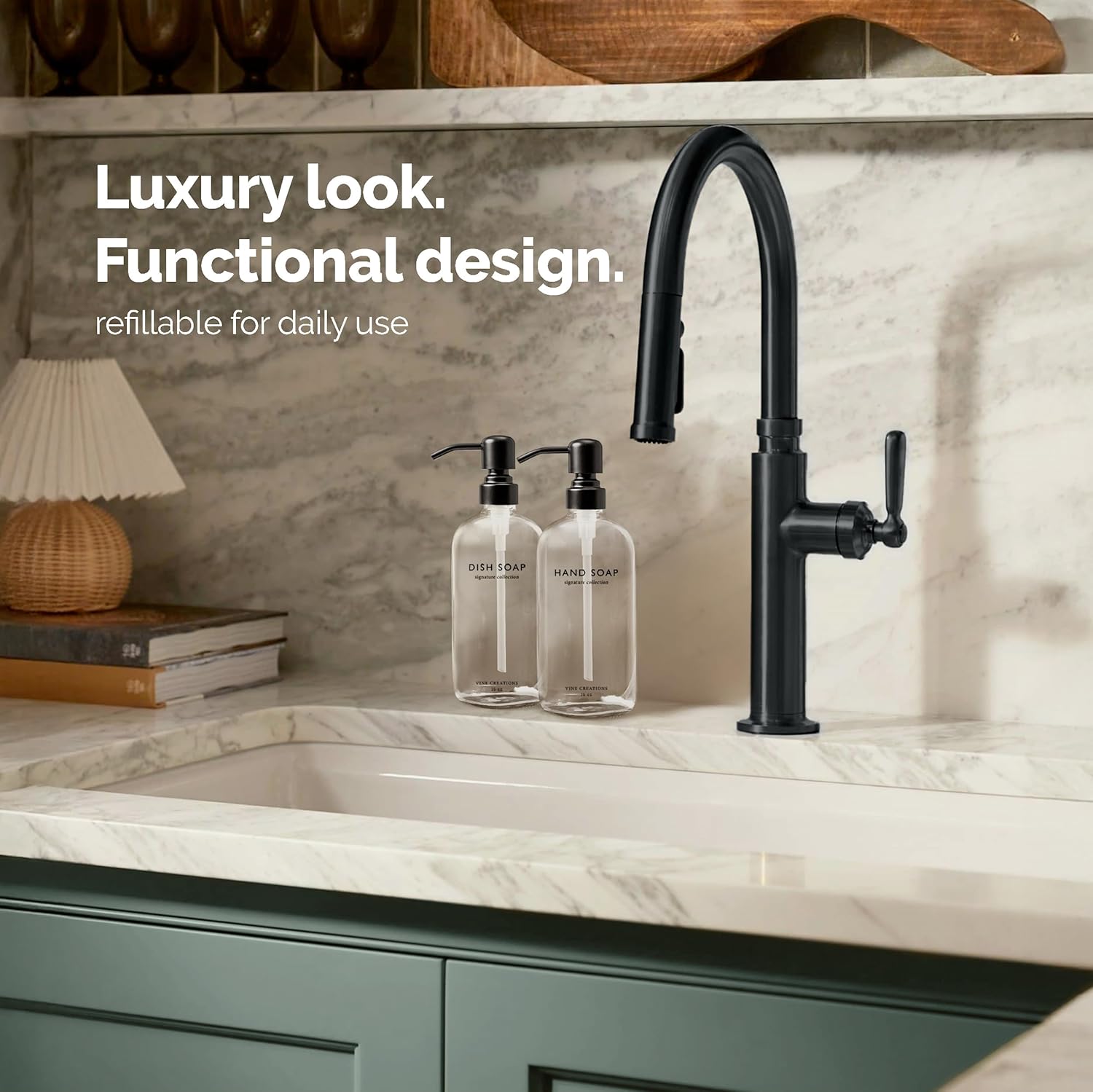 • PRINTED WITH PURPOSE – Hand Soap and Dish Soap are printed directly onto the glass in a refined, modern font—no stickers, no smudges. A minimal, permanent design that keeps your kitchen looking curated and clean.