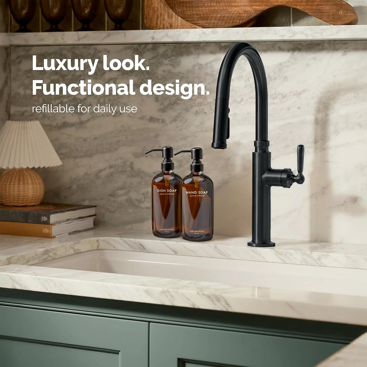 • BUILT TO PERFORM – Each dispenser is topped with a matte black stainless steel pump that’s as durable as it is refined. Rust-resistant, smooth to use, and designed to complement any modern kitchen or bathroom.