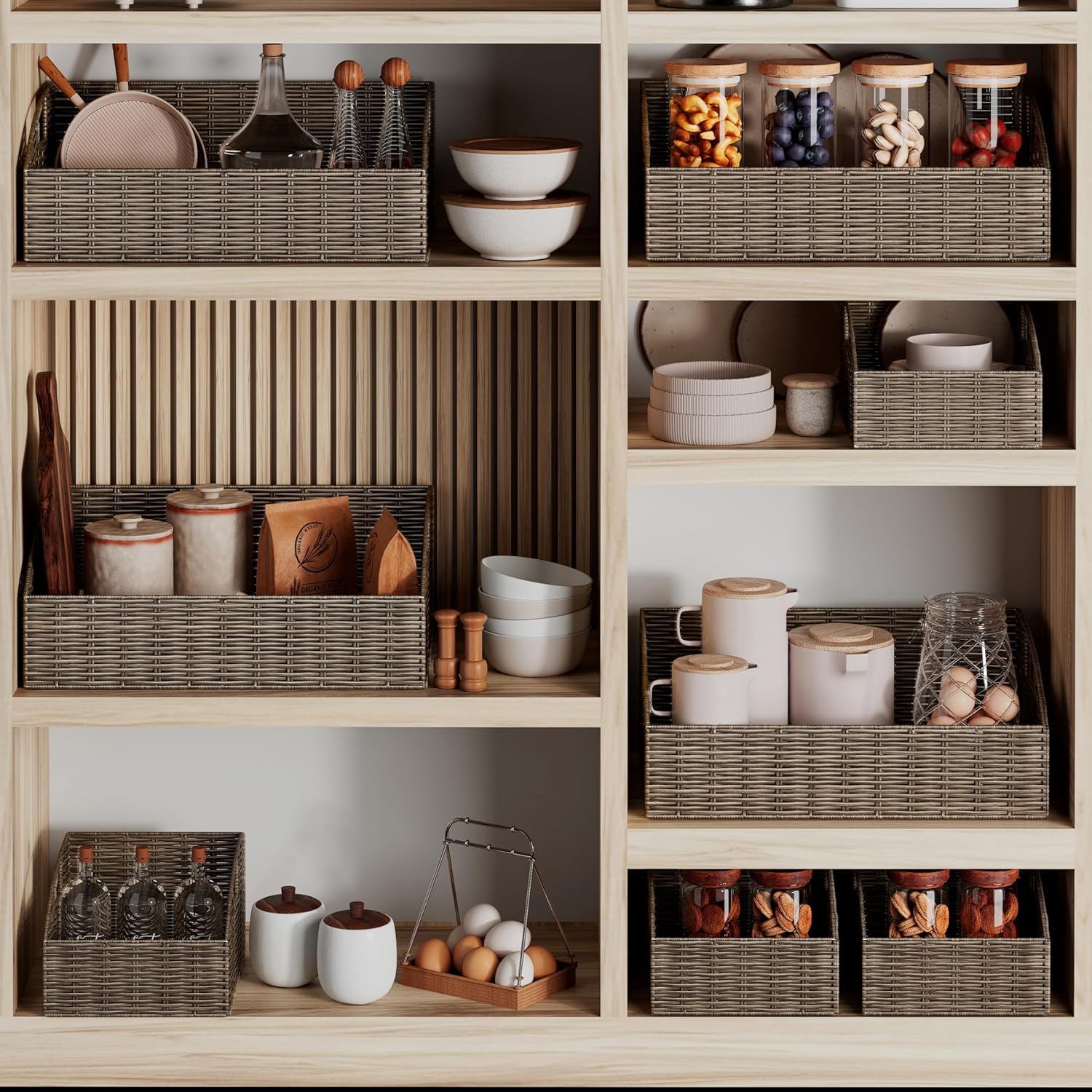 • GREAT VERSATILITY: Versatile pantry baskets provide you with a simple yet elegant way to neatly store and organize spices, vegetables, canned foods, bottles, magazines, clothes, scarves, gloves, laundry, kids' toys or other household items.
