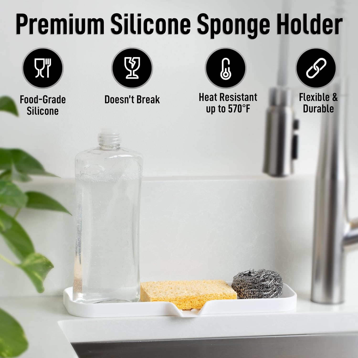 • DURABLE AND HEAT RESISTANT: Built with non-scratch silicone, this dish soap holder is thick, durable, and made to last. Our kitchen sponge holder can withstand heat up to 570°F, making it ideal for hot tools like cooking spoons, curling irons, or straighteners.