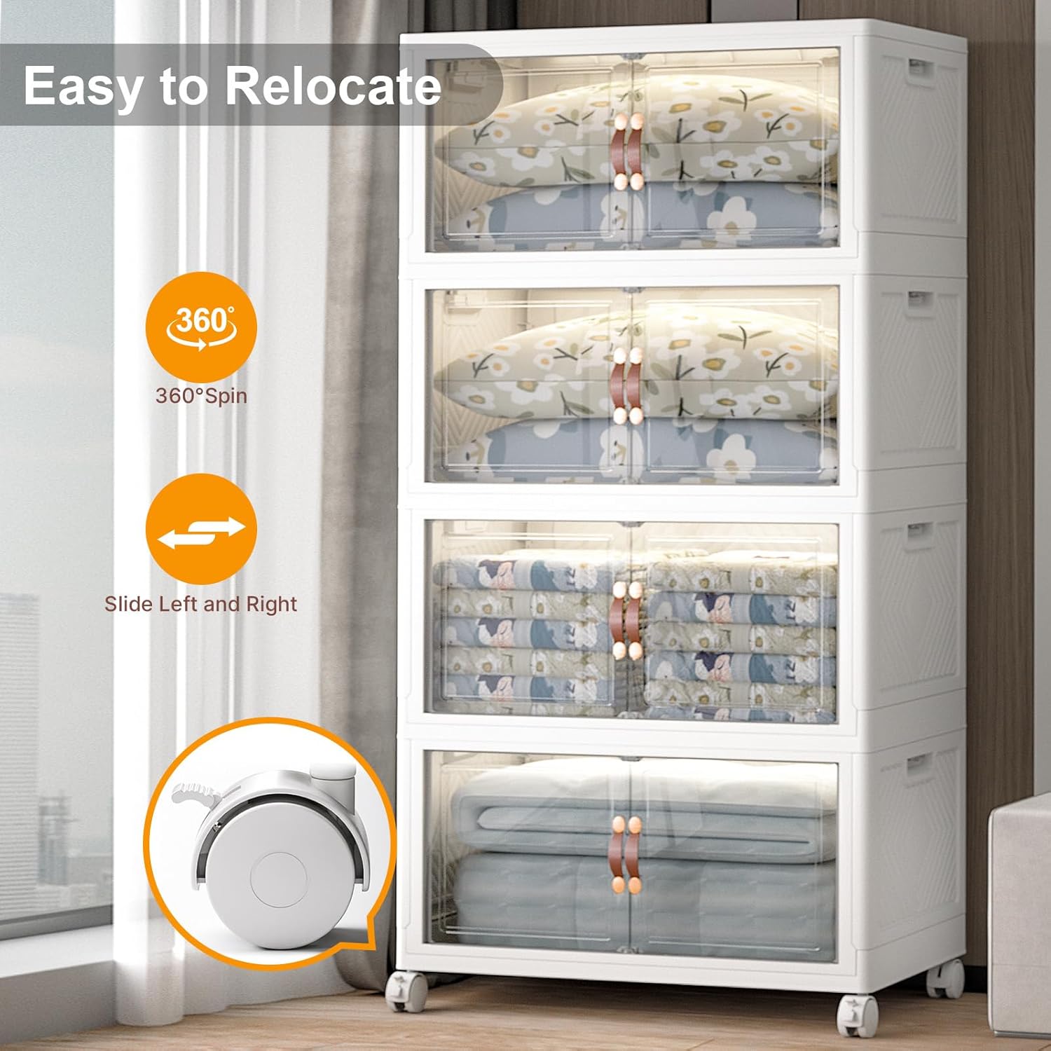 Extra Large Stackable Storage Bins with Lids & Wheels & Door, 640QT-160QT/40GAL*4Pack Foldable Collapsible Closet Organizers, Plastic Containers Drawers for Bedroom Dorm Garage Sturdy MAX