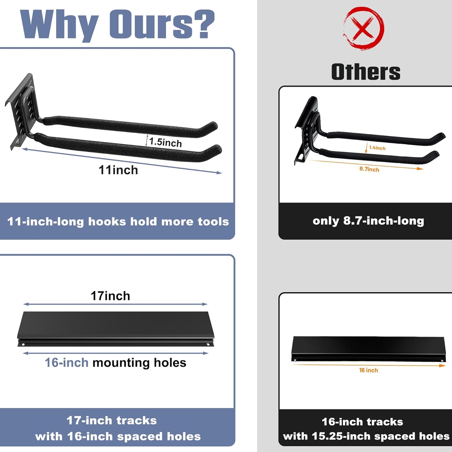 • 8 Heavy-Duty Double-Prong Hooks: Each 11-inch hook holds 3-5 tools or 4-5 folding chairs, providing efficient storage for various items. Designed for secure and accessible organization