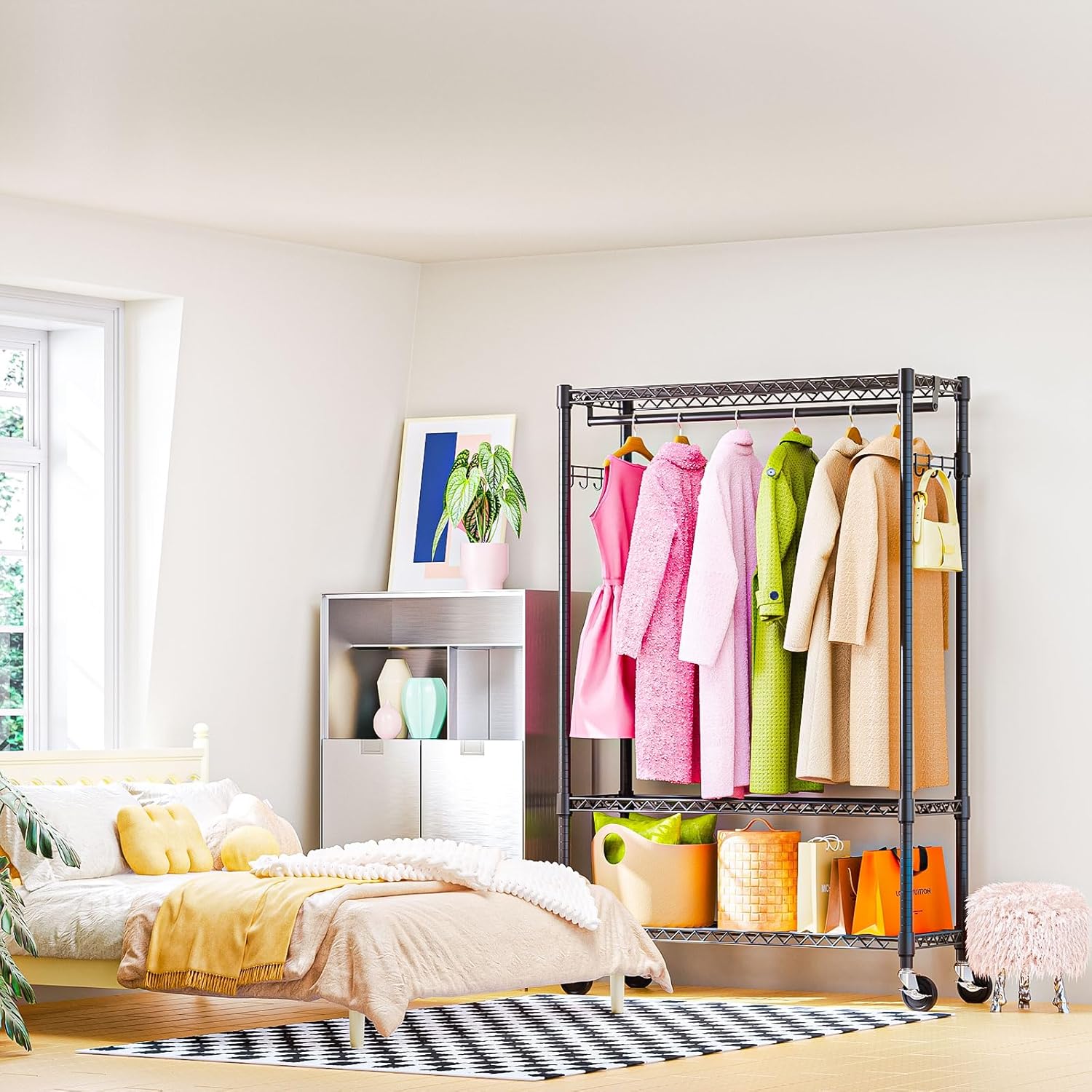 Heavy Duty Rolling Garment Rack 3 Tiers Adjustable Wire Shelving Clothes Rack with 1 Rods and Side Hooks,Storage Closet Clothing Rack with Wheels Black 15.7" D x 45.3" W x 75.6" H