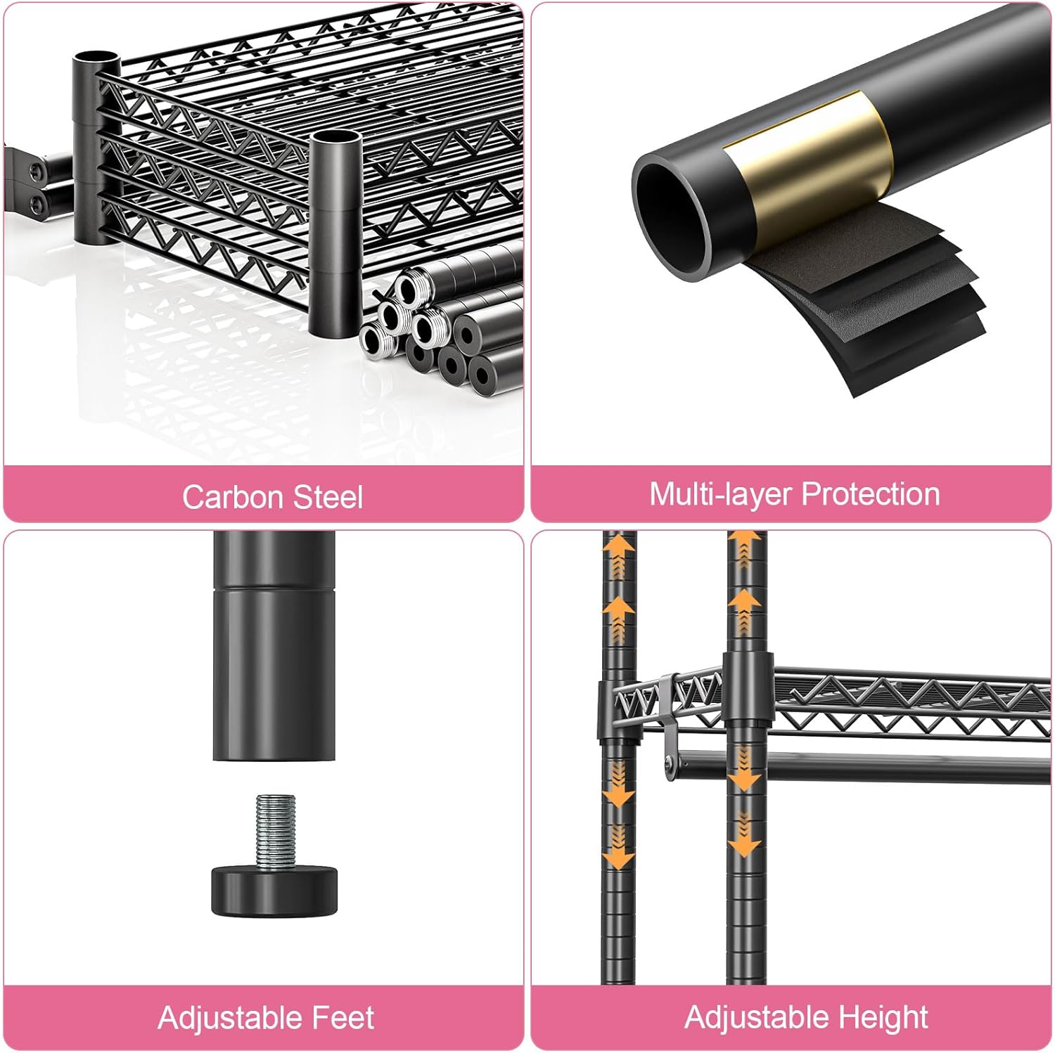 Heavy Duty Rolling Garment Rack 3 Tiers Adjustable Wire Shelving Clothes Rack with 2 Rods and Side Hooks,Storage Closet Clothing Rack with Wheels Black 15.7" D x 45.3" W x 79.6" H