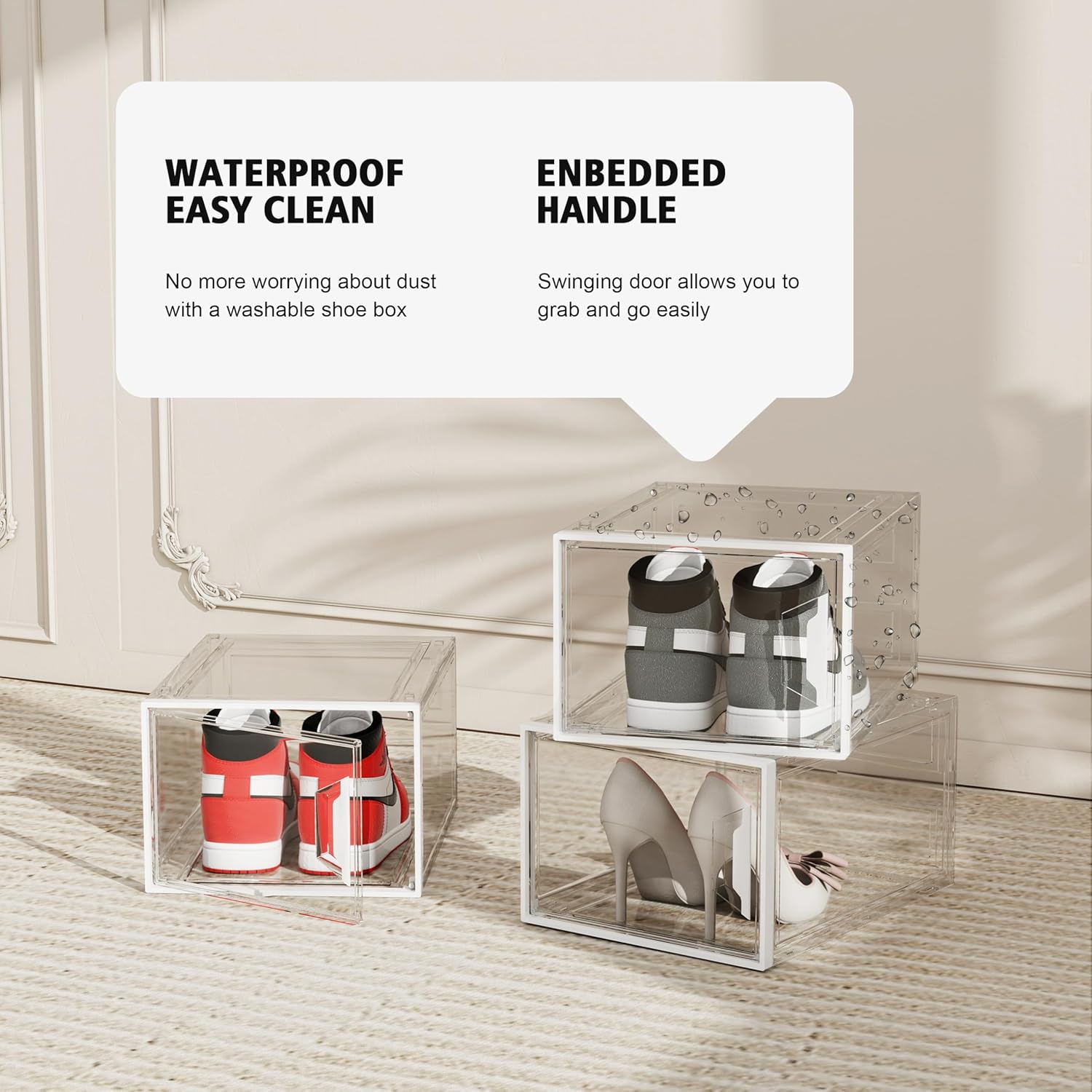 Shoe Storage Boxes Fit Size 13, White Plastic Stackable Shoe Organizer for Closet, Shoe Rack & Holder Sneaker Container, Thicken & Sturdy 6-Sided Hard Clear White 6 Pack