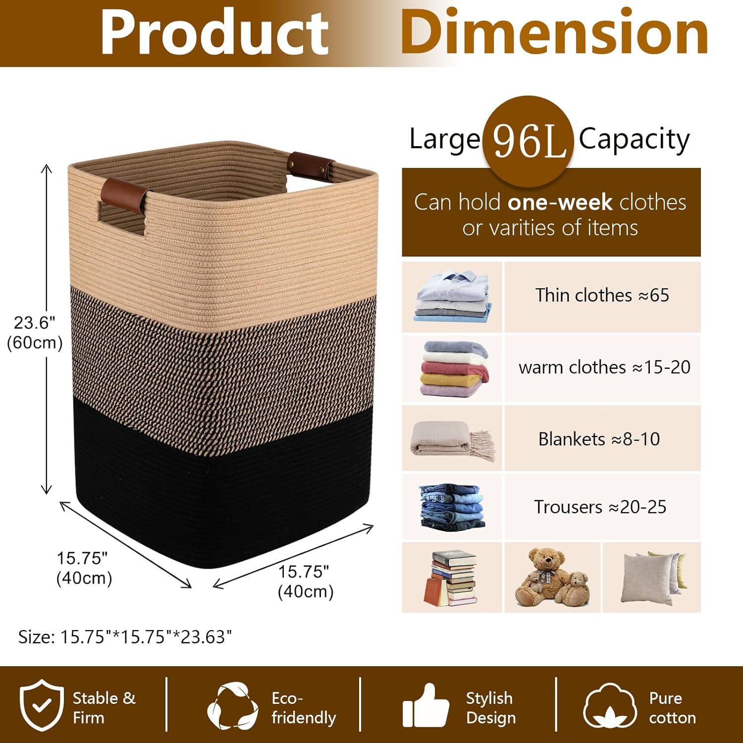 • Oversized Laundry Hamper: 15.7"*15"*23.6"extra large laundry basket. Super large capacity of 96 L, which can meet the clothing storage needs of a family for a week. Large basket can also store bulky items like blankets, comforters, duvets, throw pillows