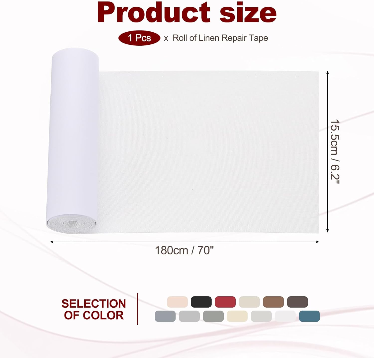 • Specification: Size: 180x15.5cm/70x6.2 inch; Thickness: 0.1cm/0.04 inch; Color: White; Material: Line; Packing List: 1 Roll Linen Repair Tape