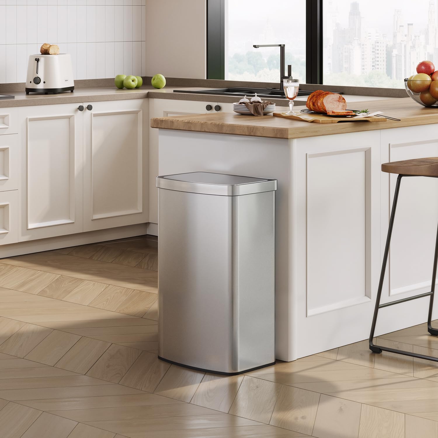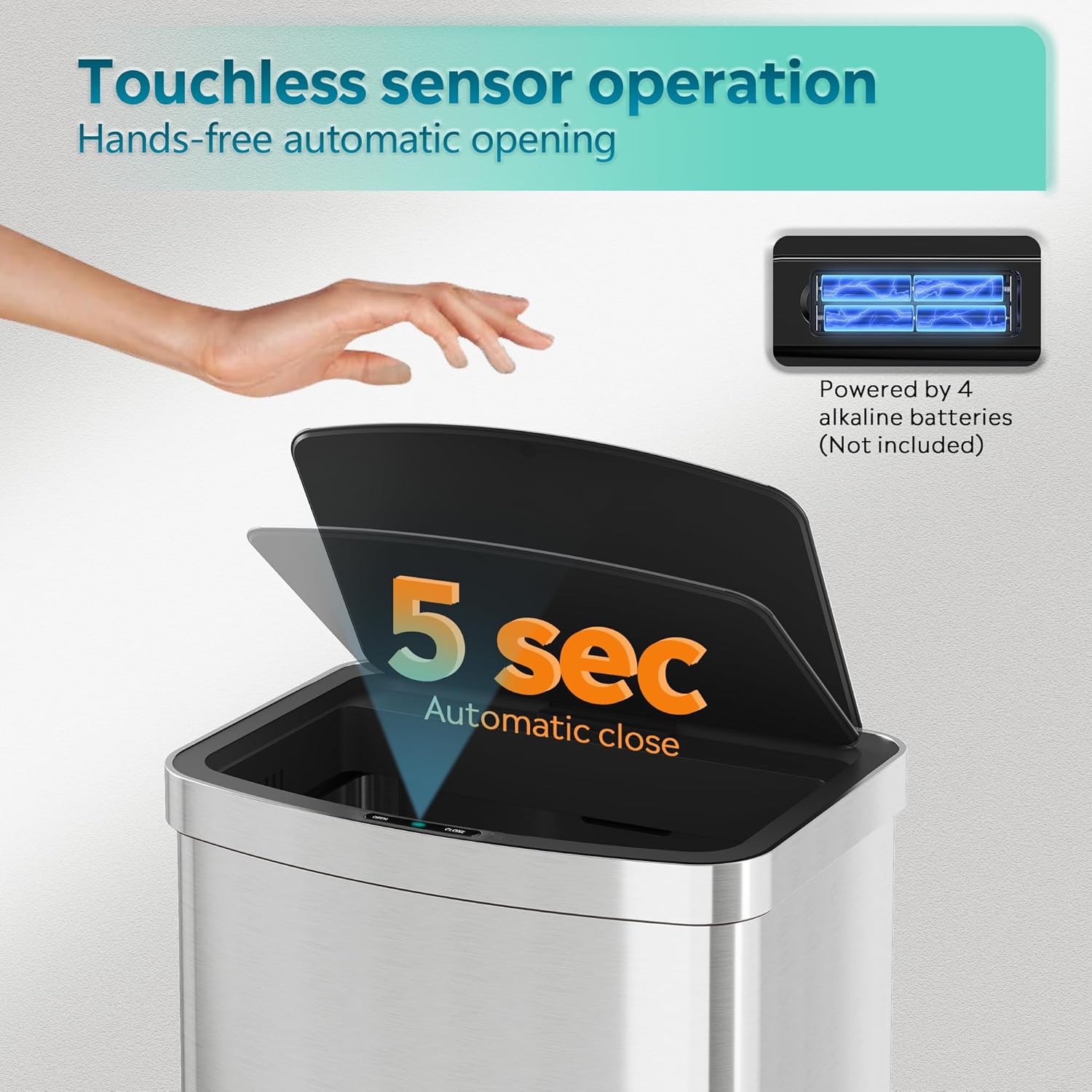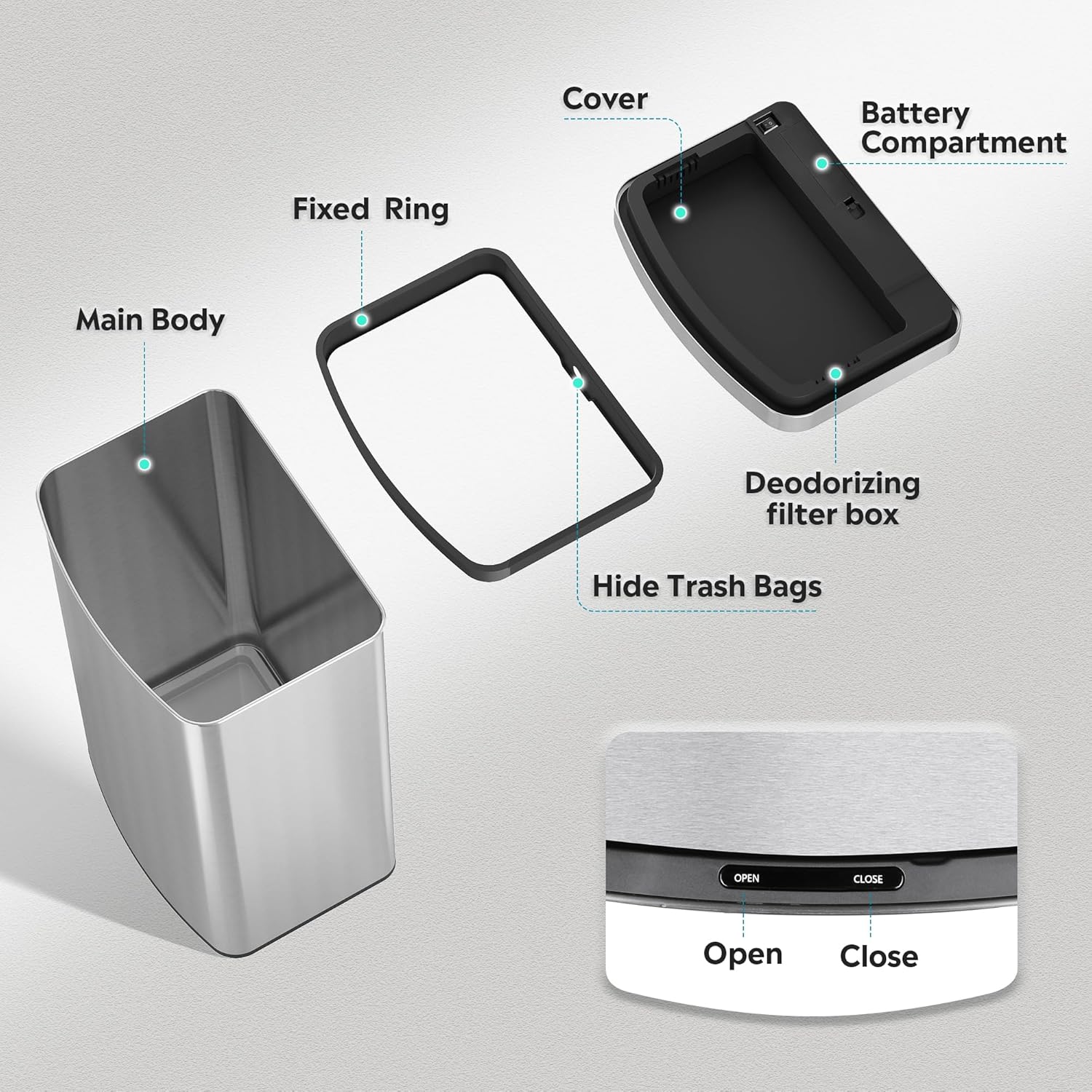 • Sleek & Smudge-Proof: Crafted with anti-fingerprint stainless steel, this touchless garbage can resists smudges while maintaining a sleek, scratch-resistant finish. Durable and visually versatile, it blends effortlessly into any decor.