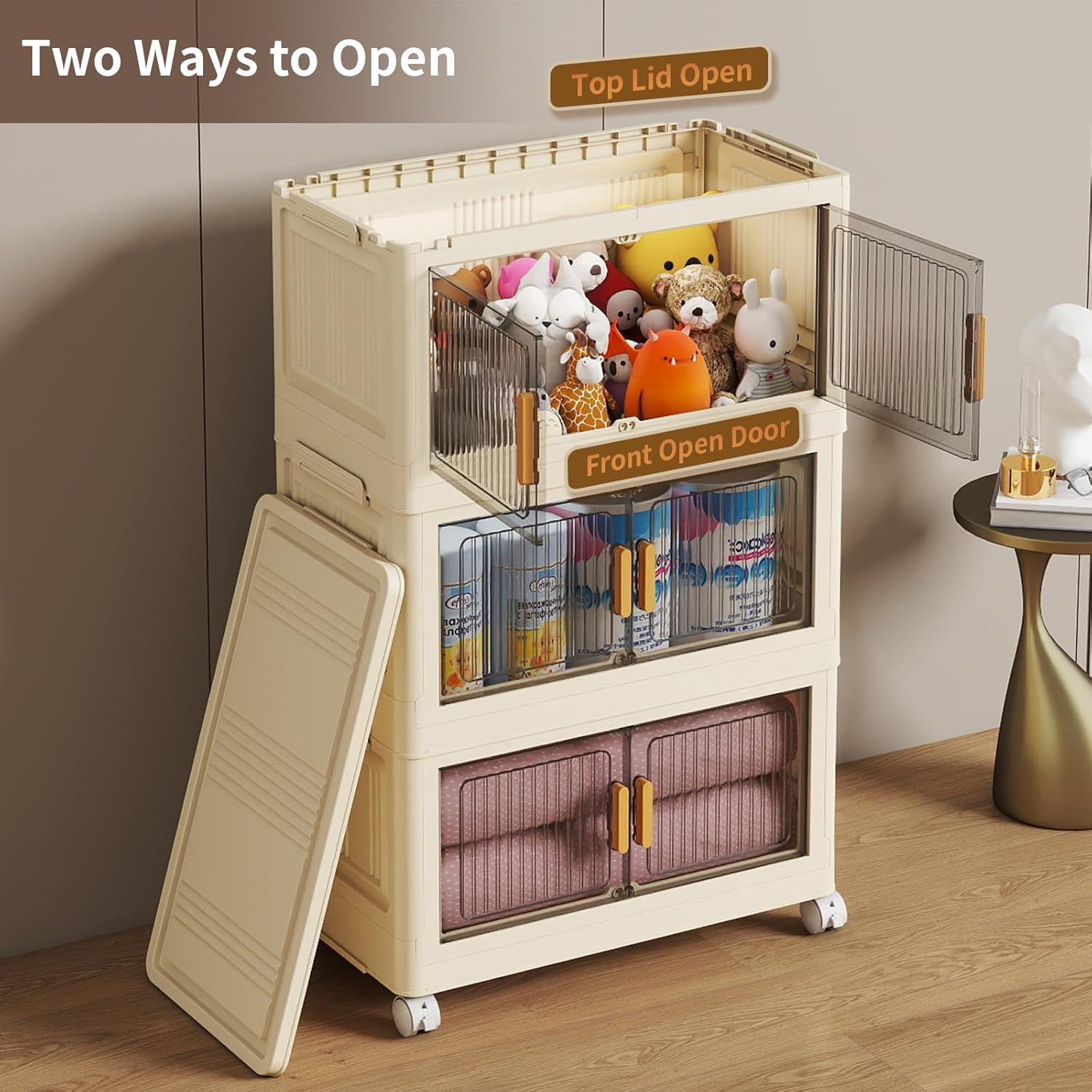 • Stackable & Removable Design: Foldable storage bins and a stackable storage box. Each level has matching grooves and clasps on the top sides to lock the storage bins securely, and the foldable design maximizes space in your home when not in use. There are 3 rotating wheels on the bottom for easy movement