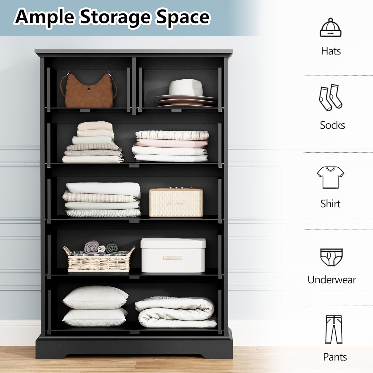 - Durable & Stable Construction: Crafted from high-density engineered wood, this sturdy tall dresser is built for durability. It features strong legs and a thick top that holds up to 180 lbs. For added peace of mind, an anti-tip device on the back panel keeps it secure, making this closet dresser, hallway dresser, or living room dresser both safe and reliable in any home.