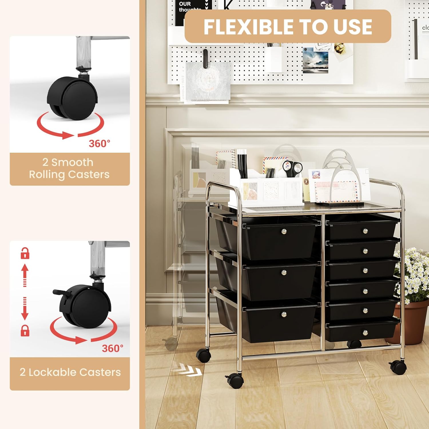 GOFLAME 9-Drawer Rolling Storage Cart, Mobile Utility Cart with Removable Drawers & Metal Frame, Art Craft Organizer Cart with Lockable Wheels, Storage Drawer Cart for Home Office School, Black