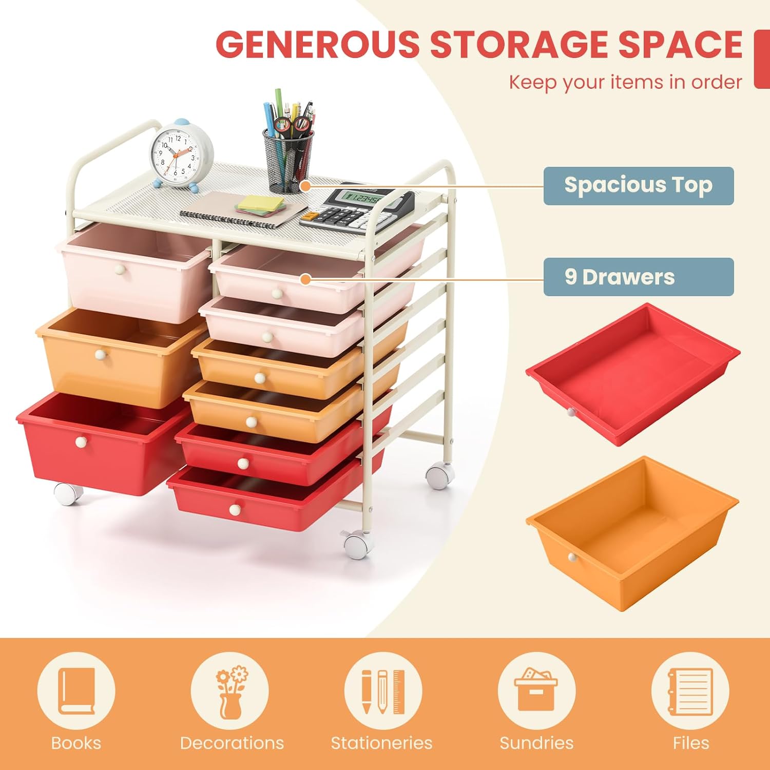 • 9 Removable Drawers: There are 3 large sized drawers (14.5" x 11.5" x 5") and 6 medium sized drawers (14.5" x 11.5" x 2.5") to store and classify sorts of files, stationery, and sundries. The spacious top is perfect for storing items that you need to access frequently.