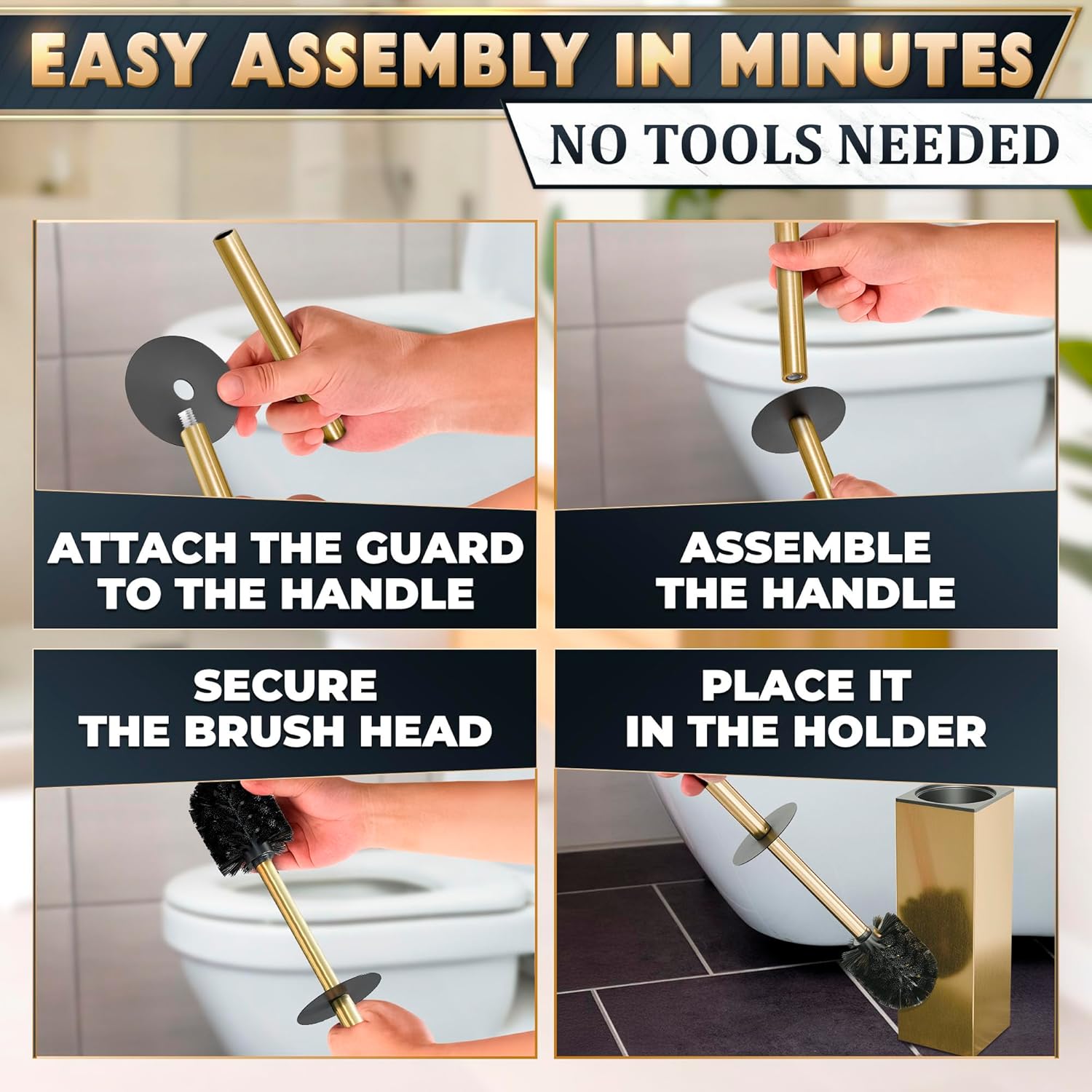 • Bathroom Toilet Brush Set With Splash Protection: Featuring a protective cover on a brushed gold toilet handle, our toilet brushes for bathroom with holder shield your hands from stains