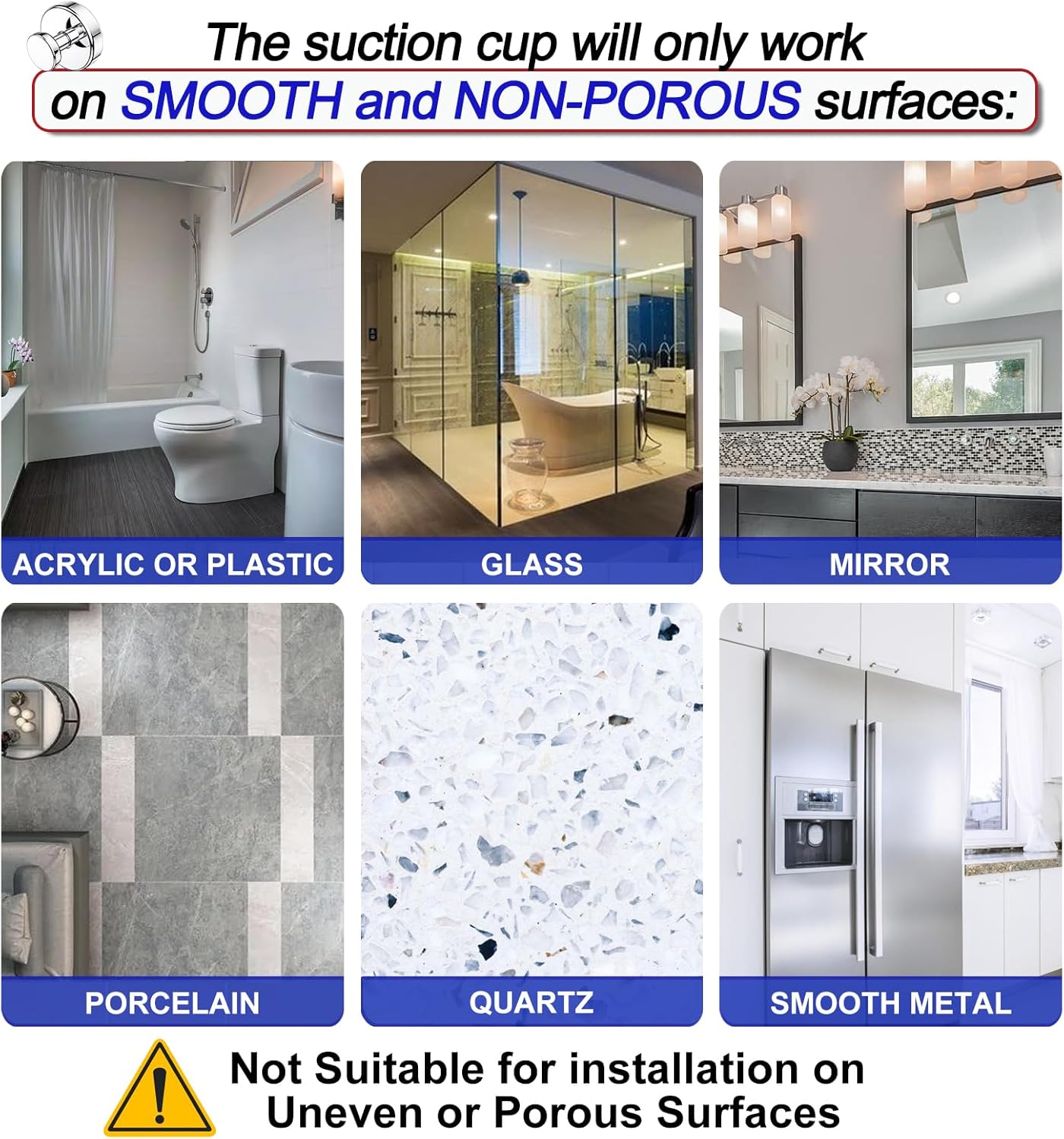 • [Application Surfaces]: These suction cup hooks are suitable for Glass, Mirrors, Glossy porcelain tiles, Acrylic, Plastic, Smooth stainless steel, Quartz, Laminate, and other smooth and non-porous surfaces