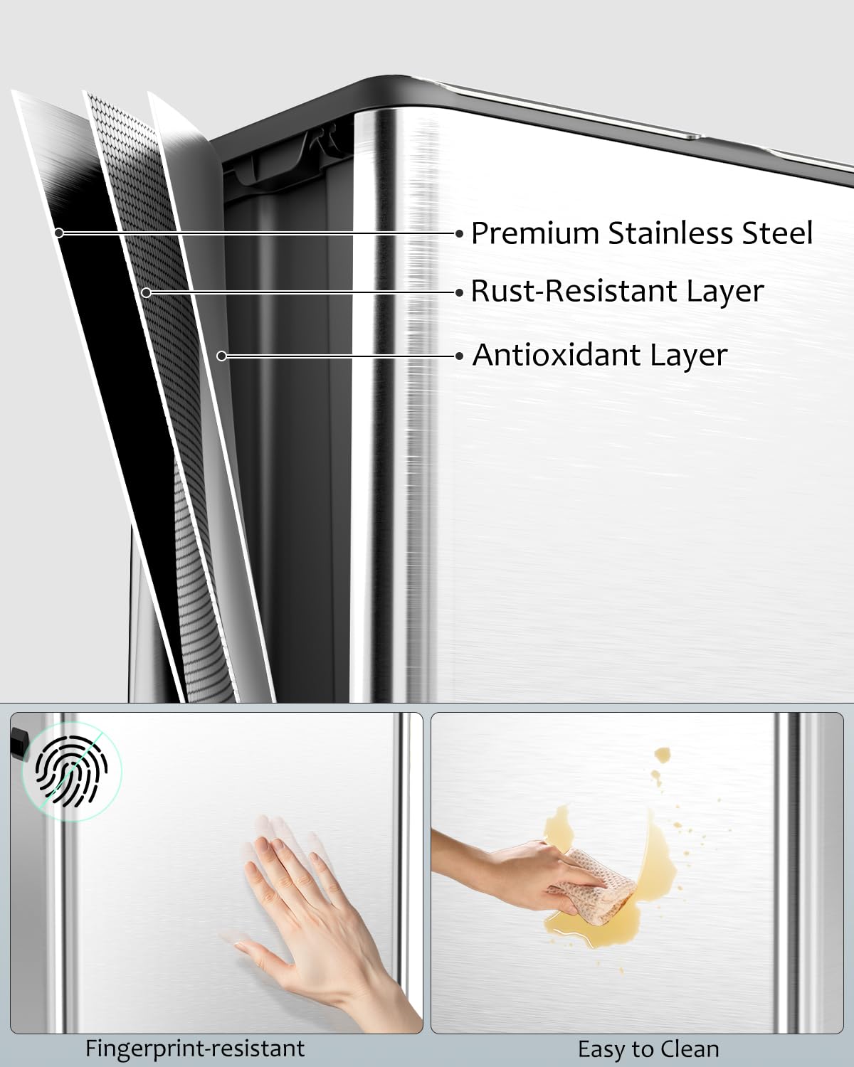 • Premium Materials: Kitchen trash bin features a sturdy stainless steel exterior, ensuring durability and anti-fingerprint. Inner barrel is made of ABS plastic, which is strong and light in weight. Surface is easy to clean, stylish appearance makes it fit any home style