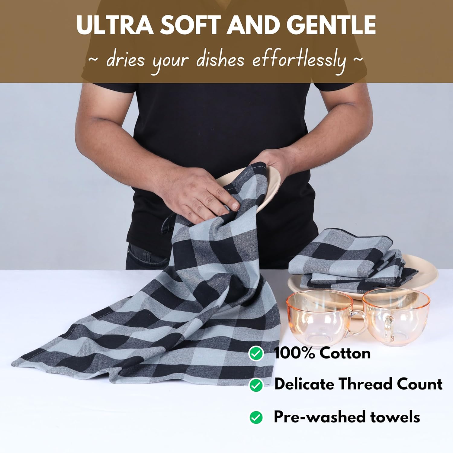 Native Fab Buffalo Check Kitchen Dish Towels, 4 Pack, Cotton, Durable, Washable 16"x26" - Tea Towel, Soft Absorbent Cleaning Towels, Hand Towels with Hanging Loop - Black, Grey