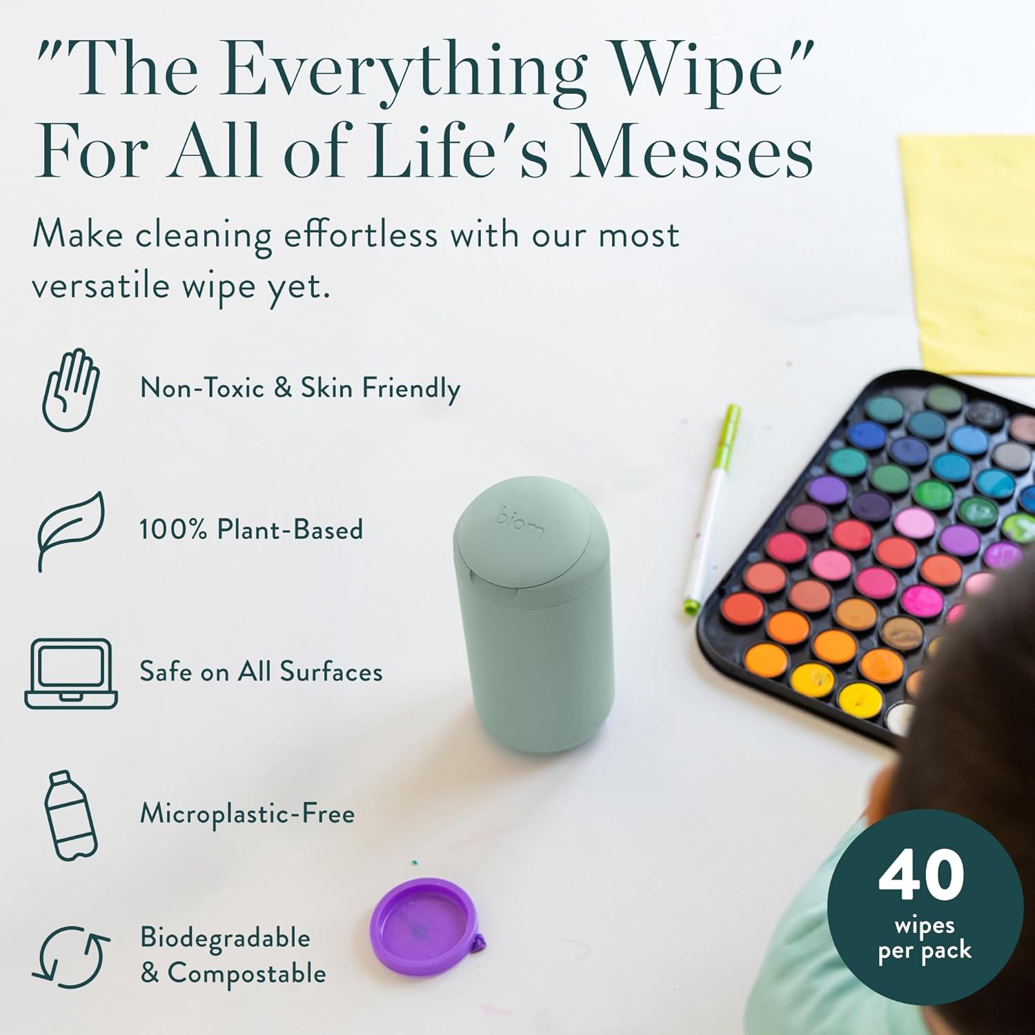 - NEW MINI SIZE: Meet Biom’s All-Purpose Mini—your compact, refillable solution for quick clean-ups wherever life takes you. Safe for skin and surfaces, these 100% plant-based, biodegradable wipes are perfect for sticky hands, messy faces, countertops, car spills, pet paws, and more.