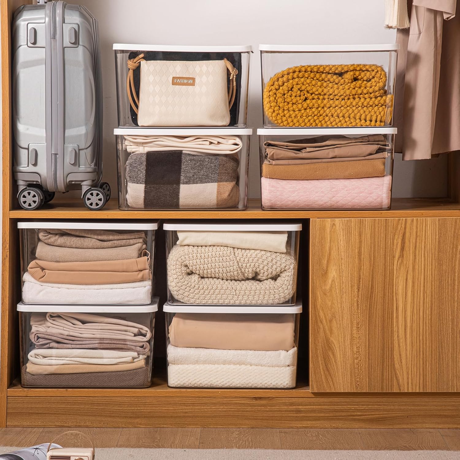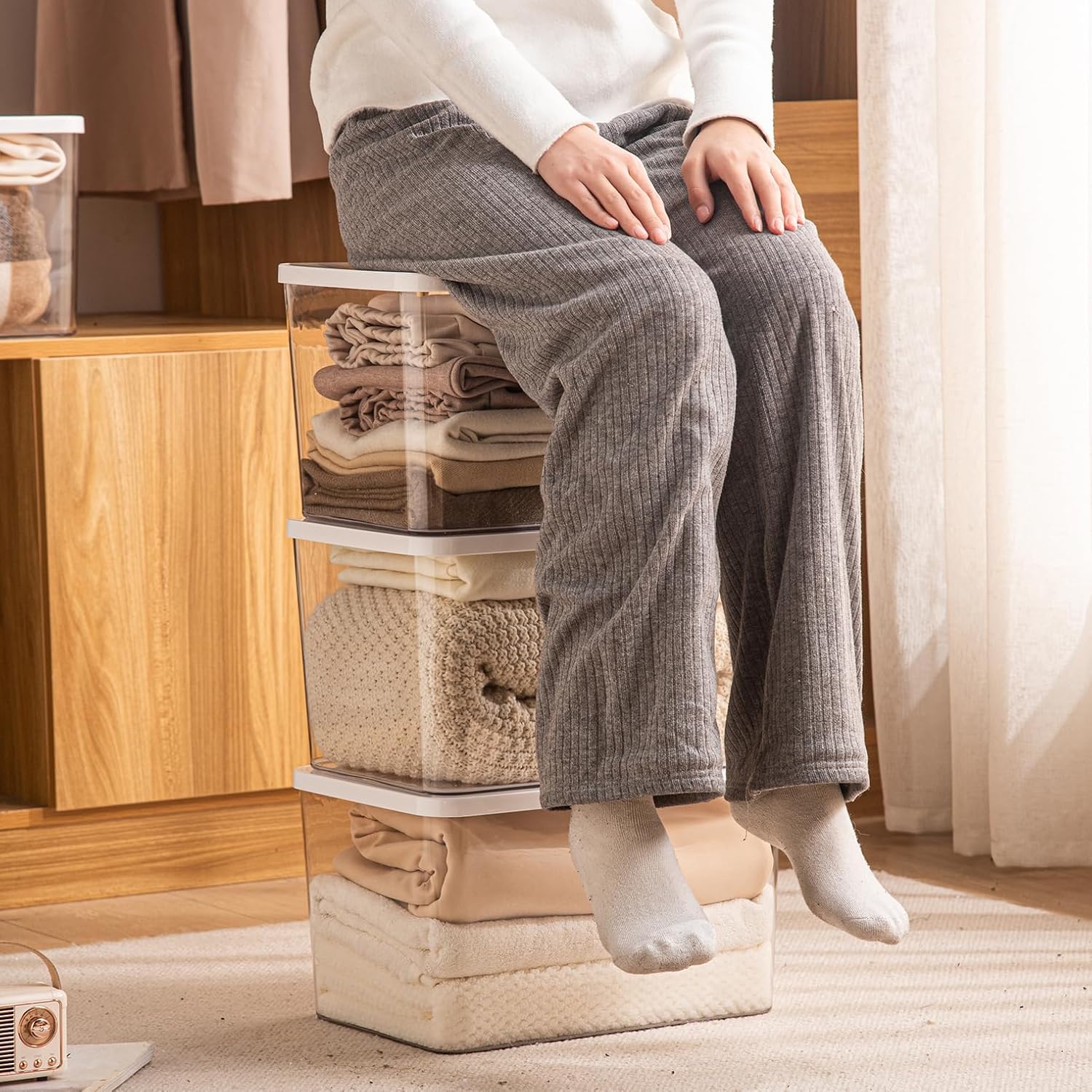 • 4. These large storage boxes with lids are perfect for sorting and storing clothes, food, shoes, toys, books, scarves, and more. Providing dust protection, the stackable design will fully utilize your closet or other space.