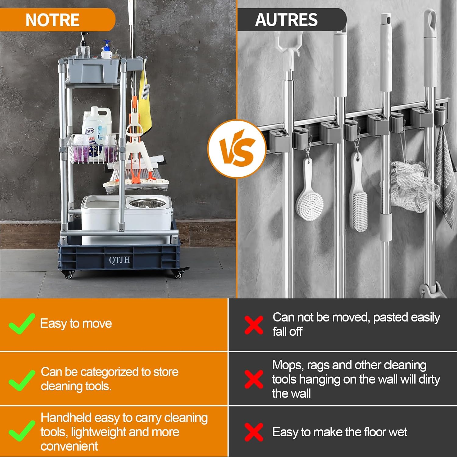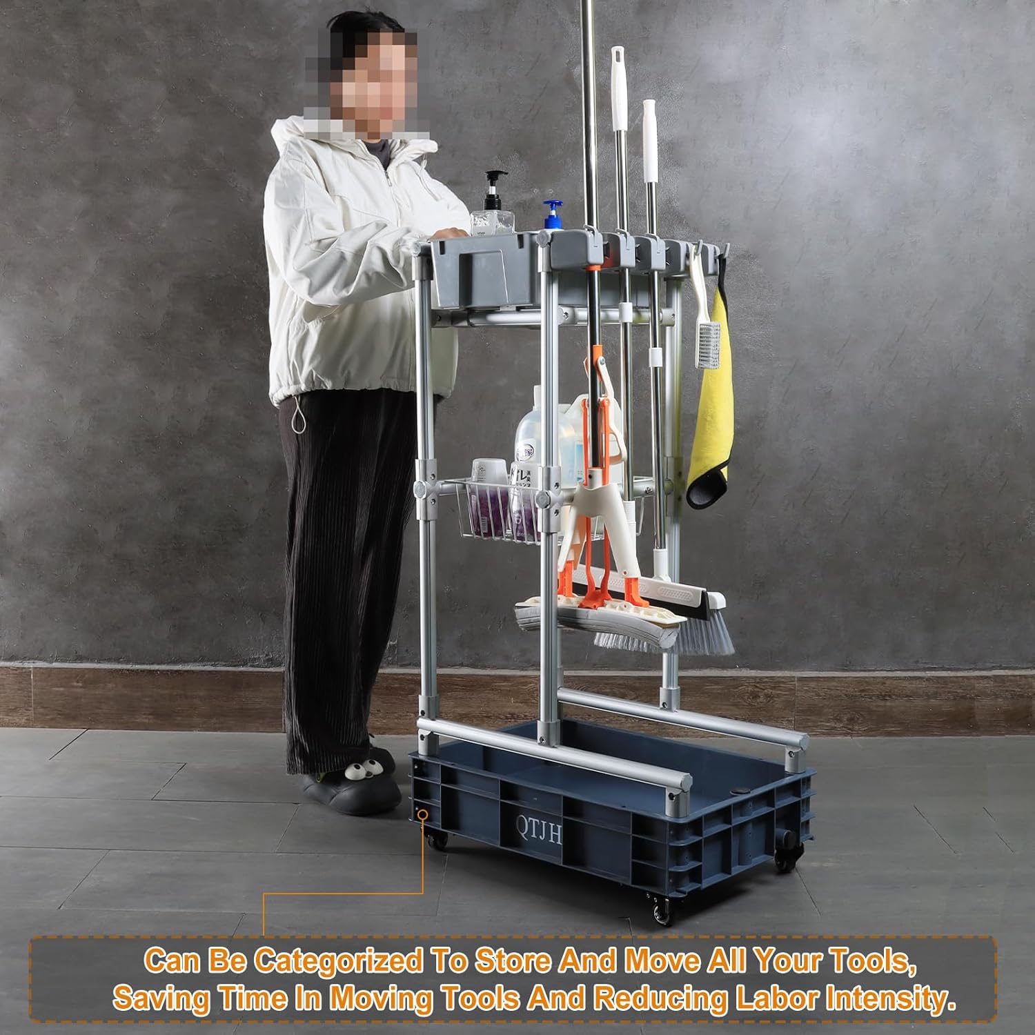 Rolling Cleaning Cart with Mop & Broom Organizer , Convenient Storage Cart for Janitorial Supplies, Tools, and Cleaning Equipment , Floor Cleaning Station with Wheels for Housekeeping, Garage &Garden