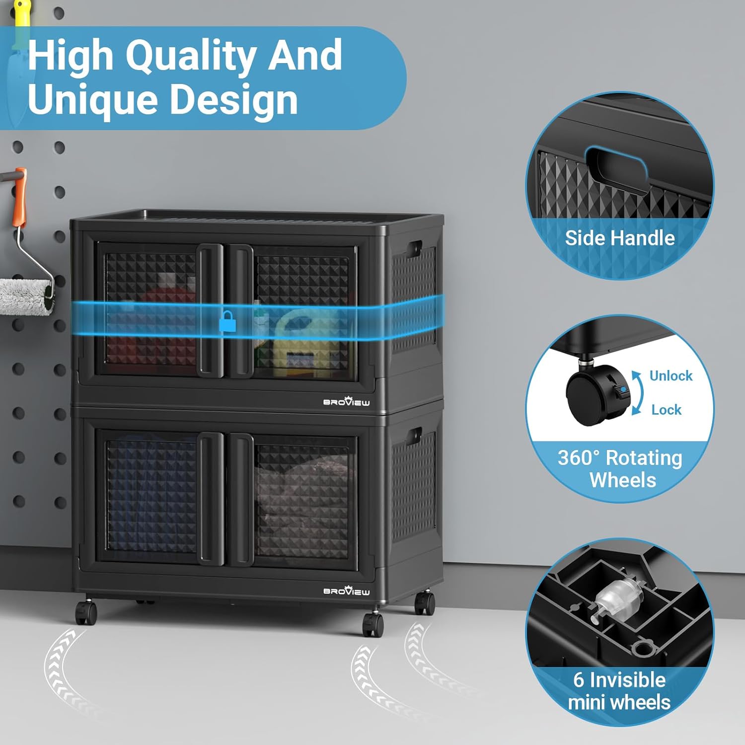 BROVIEW 600Qt Stackable Storage Bins with Lids, 150Gal Closet Organizers and Storage Drawer, Plastic Collapsible Storage Bins with Doors, Heavy Duty Store Box Cabinet for Home Kitchen, 6Pack Black