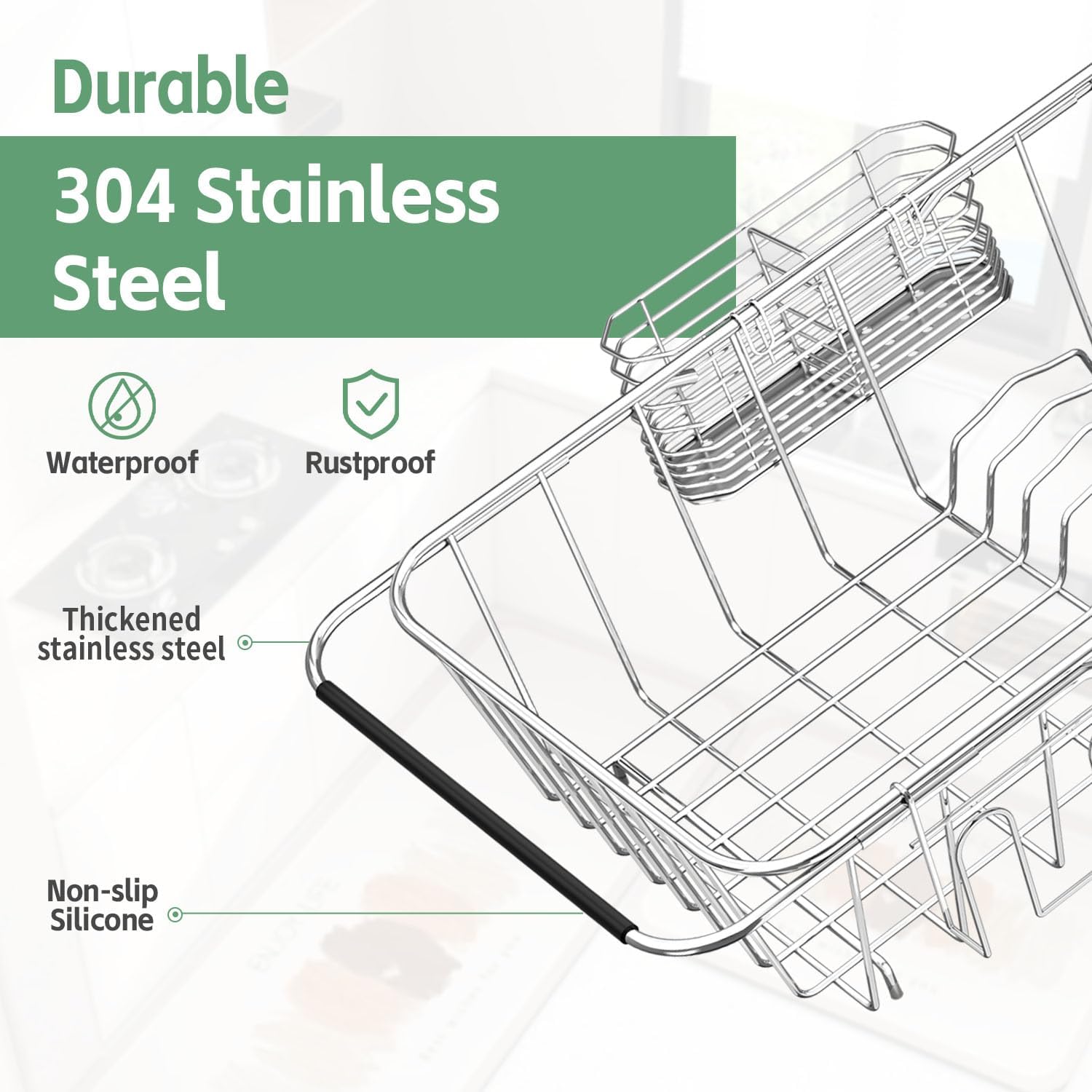 - Special Feature : 304 Stainless Steel Silverware Holder, Dishes Slot Available, Fit most sinks, Non-slip Adjustable arm, Rustproof 304 Stainless Steel Silverware Holder, Dishes Slot Available, Fit most sinks, Non-slip Adjustable arm, Rustproof